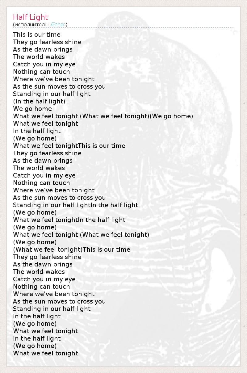 This is our time They go fearless shine As the dawn brings The world wakes Catch you in my eye Nothing can touch Where we've been tonight As the sun moves to cross you Standing in our half light (In the half light) We go home What we feel tonight (What we feel tonight)(We go home) What we feel tonight In the half light (We go home) What we feel tonightThis is our time They go fearless shine As the dawn brings The world wakes Catch you in my eye Nothing can touch Where we've been tonight As the sun moves to cross you Standing in our half lightIn the half light (We go home) What we feel tonightIn the half light (We go home) What we feel tonight (What we feel tonight) (We go home) (What we feel tonight)This is our time They go fearless shine As the dawn brings The world wakes Catch you in my eye Nothing can touch Where we've been tonight As the sun moves to cross you Standing in our half light In the half light (We go home) What we feel tonight In the half light (We go home) What we feel tonight