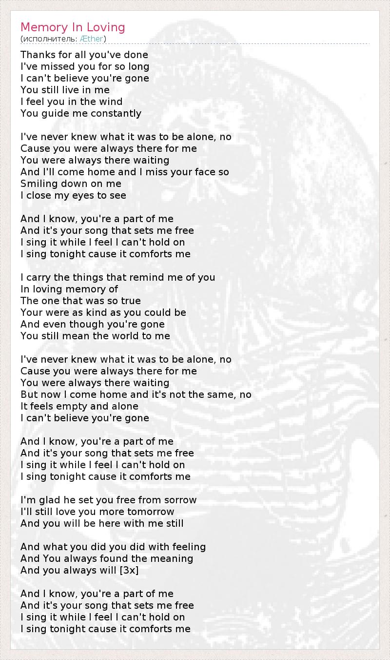 Thanks for all you've done I've missed you for so long I can't believe you're gone You still live in me I feel you in the wind You guide me constantly I've never knew what it was to be alone, no Cause you were always there for me You were always there waiting And I'll come home and I miss your face so Smiling down on me I close my eyes to see And I know, you're a part of me And it's your song that sets me free I sing it while I feel I can't hold on I sing tonight cause it comforts me I carry the things that remind me of you In loving memory of The one that was so true Your were as kind as you could be And even though you're gone You still mean the world to me I've never knew what it was to be alone, no Cause you were always there for me You were always there waiting But now I come home and it's not the same, no It feels empty and alone I can't believe you're gone And I know, you're a part of me And it's your song that sets me free I sing it while I feel I can't hold on I sing tonight cause it comforts me I'm glad he set you free from sorrow I'll still love you more tomorrow And you will be here with me still And what you did you did with feeling And You always found the meaning And you always will [3x] And I know, you're a part of me And it's your song that sets me free I sing it while I feel I can't hold on I sing tonight cause it comforts me
