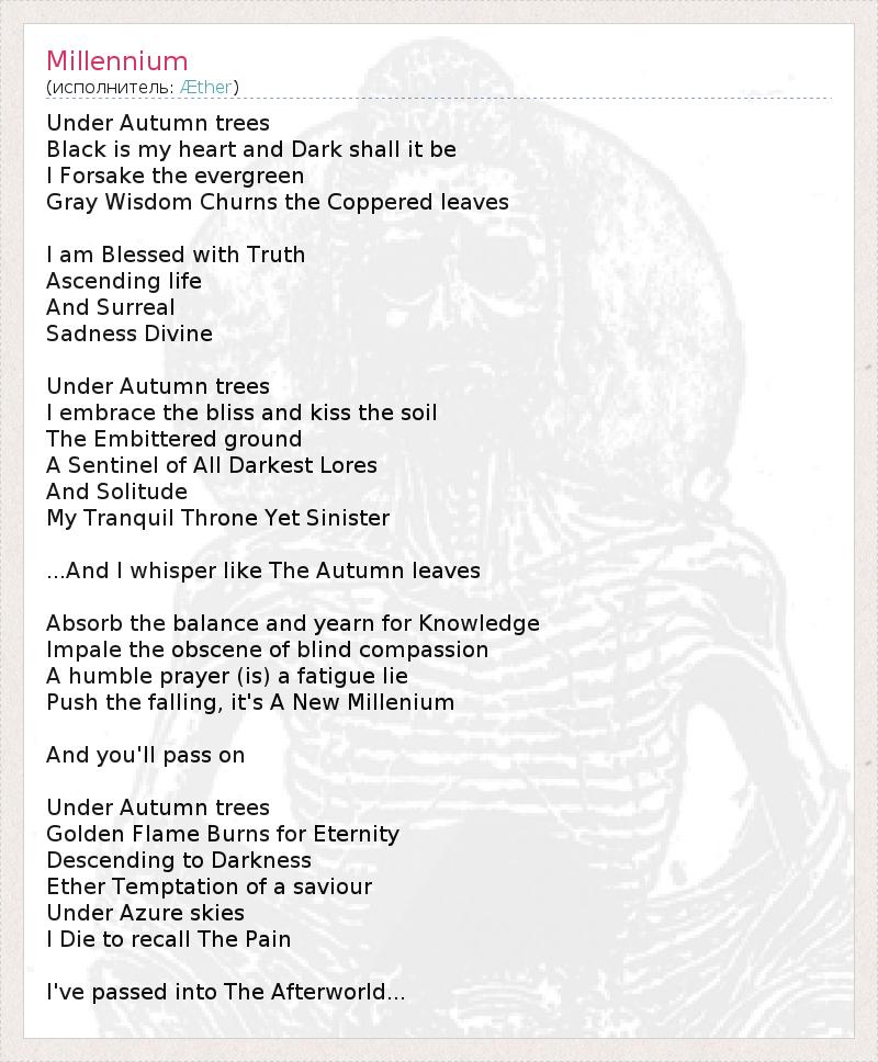 Under Autumn trees Black is my heart and Dark shall it be I Forsake the evergreen Gray Wisdom Churns the Coppered leaves I am Blessed with Truth Ascending life And Surreal Sadness Divine Under Autumn trees I embrace the bliss and kiss the soil The Embittered ground A Sentinel of All Darkest Lores And Solitude My Tranquil Throne Yet Sinister ...And I whisper like The Autumn leaves Absorb the balance and yearn for Knowledge Impale the obscene of blind compassion A humble prayer (is) a fatigue lie Push the falling, it's A New Millenium And you'll pass on Under Autumn trees Golden Flame Burns for Eternity Descending to Darkness Ether Temptation of a saviour Under Azure skies I Die to recall The Pain I've passed into The Afterworld...