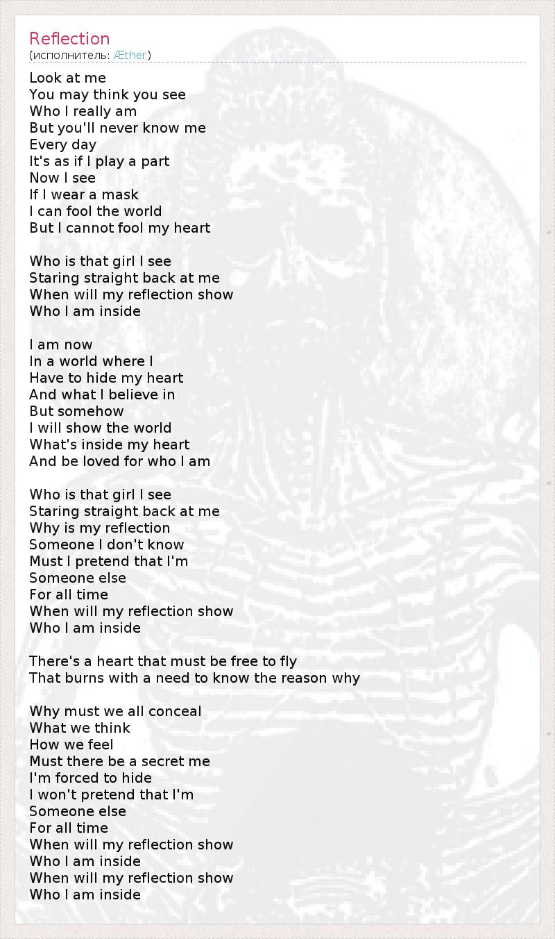 Посмотри на меня ты можешь думать,что видишь меня настоящую но ты никогда не узнаешь меня каждый день это часть моей игры сейчас я вижу,что если ношу маску то я могу обманывать мир,но я не могу обманывать свое сердце Кто та девочка,стоящая прямо за моей спиной, когда мое отражение покажет кто я внутри Я сейчас в мире,где должна прятать свое сердце и верю в то,что как-нибудь я покажу миру,что находится у меня в сердце и люблю то кем я являюсь Кто та девочка,стоящая прямо за моей спиной почему в моем отражении кто-то кого я не знала может я притворялась кем-то другим все это время когда мое отражение покажет кто я внутри Там сердце,котрое должно быть свободно к полету которое горит от необходимости знать причину почему почему мы все должны скрывать то,что думаем что чувствуем должна быть секретность я вынуждена прятаться Я притворялась,что я кто-то другой все это время когда мое отражение покажет кто я внутри когда мое отражение покажет кто я внутри