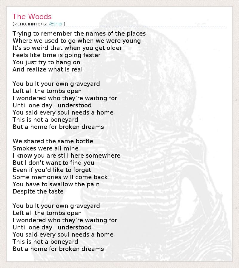 Пытаюсь вспомнить названия тех мест, Куда мы любили ходить, когда были молоды. Так странно: когда становишься старше, Кажется, что время летит быстрее. Ты просто стараешься держаться И понять, что в этом мире реально. Ты построила собственное кладбище, Оставив все могилы открытыми. Я спросил: кого они ждут? Но однажды я понял... Ты говорила, что каждой душе нужно пристанище. Это не просто кости умерших – Это приют разбитых мечтаний. Мы распили с тобой на двоих бутылку, Сигареты были мои. Я знаю, ты все еще где-то здесь, Но я не хочу искать тебя. Даже если ты хочешь забыть, некоторые воспоминания возвращаются. Тебе придется проглотить эту боль, Несмотря на горечь. Ты построила собственное кладбище, Оставив все могилы открытыми. Я спросил: кого они ждут? Но однажды я понял.. Ты говорила, что каждой душе нужно пристанище. Это не просто кости умерших – Это приют разбитых мечтаний.