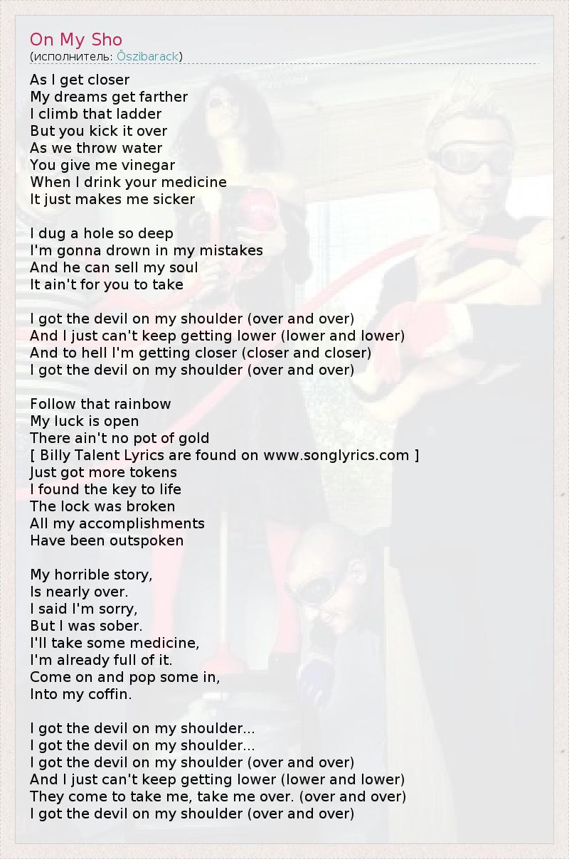 As I get closer My dreams get farther I climb that ladder But you kick it over As we throw water You give me vinegar When I drink your medicine It just makes me sicker I dug a hole so deep I'm gonna drown in my mistakes And he can sell my soul It ain't for you to take I got the devil on my shoulder (over and over) And I just can't keep getting lower (lower and lower) And to hell I'm getting closer (closer and closer) I got the devil on my shoulder (over and over) Follow that rainbow My luck is open There ain't no pot of gold [ Billy Talent Lyrics are found on www.songlyrics.com ] Just got more tokens I found the key to life The lock was broken All my accomplishments Have been outspoken My horrible story, Is nearly over. I said I'm sorry, But I was sober. I'll take some medicine, I'm already full of it. Come on and pop some in, Into my coffin. I got the devil on my shoulder... I got the devil on my shoulder... I got the devil on my shoulder (over and over) And I just can't keep getting lower (lower and lower) They come to take me, take me over. (over and over) I got the devil on my shoulder (over and over)
