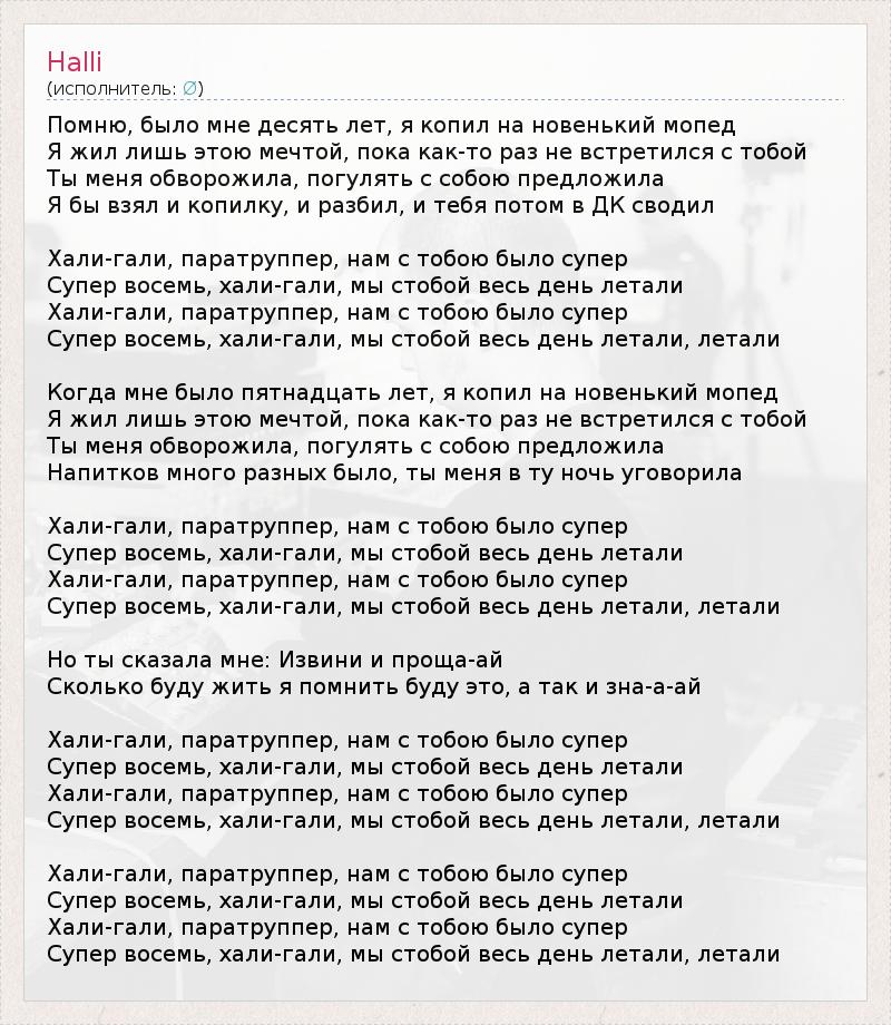 Помню, было мне десять лет, я копил на новенький мопед Я жил лишь этою мечтой, пока как-то раз не встретился с тобой Ты меня обворожила, погулять с собою предложила Я бы взял и копилку, и разбил, и тебя потом в ДК сводил Хали-гали, паратруппер, нам с тобою было супер Супер восемь, хали-гали, мы стобой весь день летали Хали-гали, паратруппер, нам с тобою было супер Супер восемь, хали-гали, мы стобой весь день летали, летали Когда мне было пятнадцать лет, я копил на новенький мопед Я жил лишь этою мечтой, пока как-то раз не встретился с тобой Ты меня обворожила, погулять с собою предложила Напитков много разных было, ты меня в ту ночь уговорила Хали-гали, паратруппер, нам с тобою было супер Супер восемь, хали-гали, мы стобой весь день летали Хали-гали, паратруппер, нам с тобою было супер Супер восемь, хали-гали, мы стобой весь день летали, летали Но ты сказала мне: Извини и проща-ай Сколько буду жить я помнить буду это, а так и зна-а-ай Хали-гали, паратруппер, нам с тобою было супер Супер восемь, хали-гали, мы стобой весь день летали Хали-гали, паратруппер, нам с тобою было супер Супер восемь, хали-гали, мы стобой весь день летали, летали Хали-гали, паратруппер, нам с тобою было супер Супер восемь, хали-гали, мы стобой весь день летали Хали-гали, паратруппер, нам с тобою было супер Супер восемь, хали-гали, мы стобой весь день летали, летали