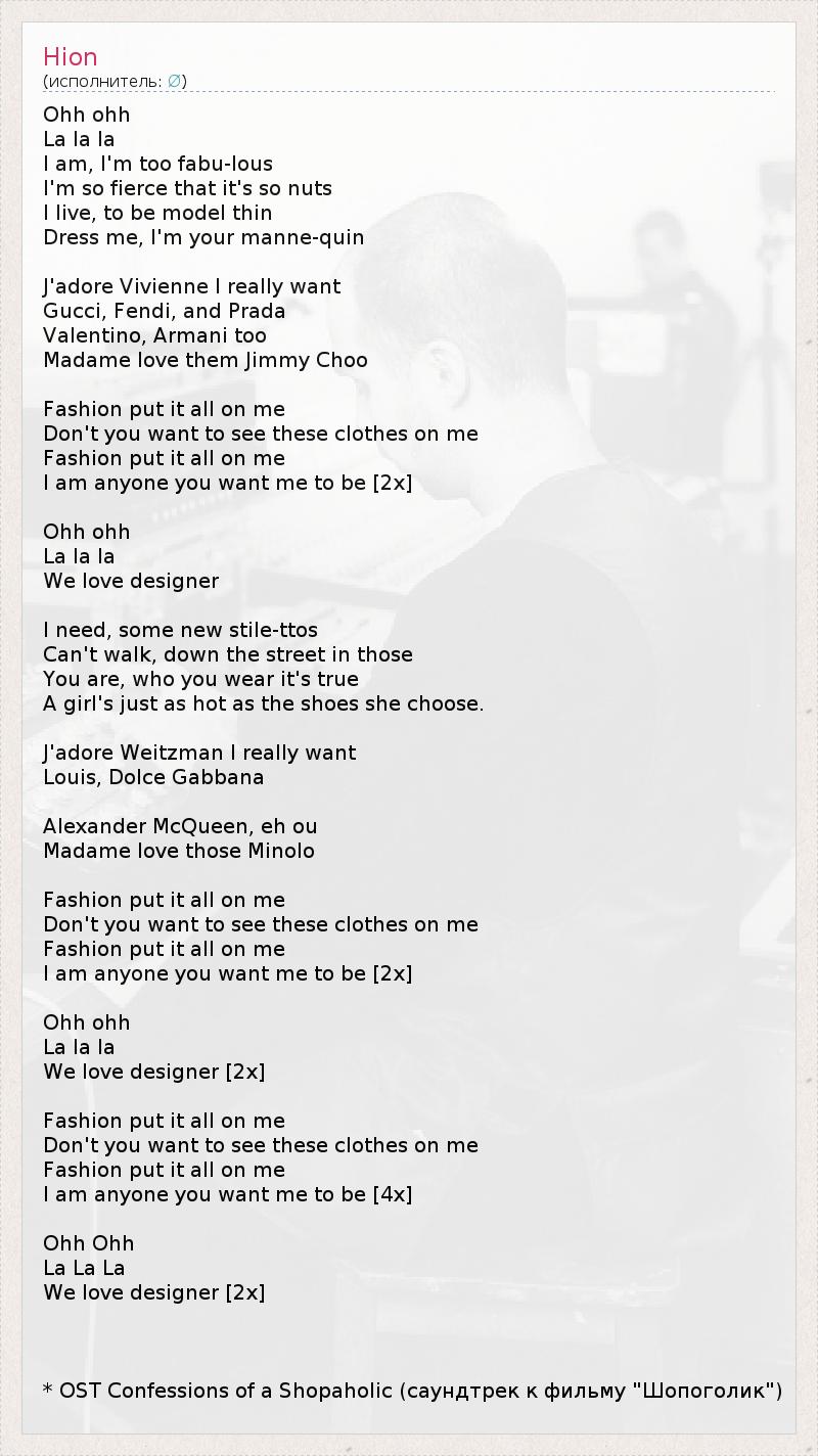Ohh ohh La la la I am, I'm too fabu-lous I'm so fierce that it's so nuts I live, to be model thin Dress me, I'm your manne-quin J'adore Vivienne I really want Gucci, Fendi, and Prada Valentino, Armani too Madame love them Jimmy Choo Fashion put it all on me Don't you want to see these clothes on me Fashion put it all on me I am anyone you want me to be [2x] Ohh ohh La la la We love designer I need, some new stile-ttos Can't walk, down the street in those You are, who you wear it's true A girl's just as hot as the shoes she choose. J'adore Weitzman I really want Louis, Dolce Gabbana Alexander McQueen, eh ou Madame love those Minolo Fashion put it all on me Don't you want to see these clothes on me Fashion put it all on me I am anyone you want me to be [2x] Ohh ohh La la la We love designer [2x] Fashion put it all on me Don't you want to see these clothes on me Fashion put it all on me I am anyone you want me to be [4x] Ohh Ohh La La La We love designer [2x] * OST Confessions of a Shopaholic (саундтрек к фильму "Шопоголик")