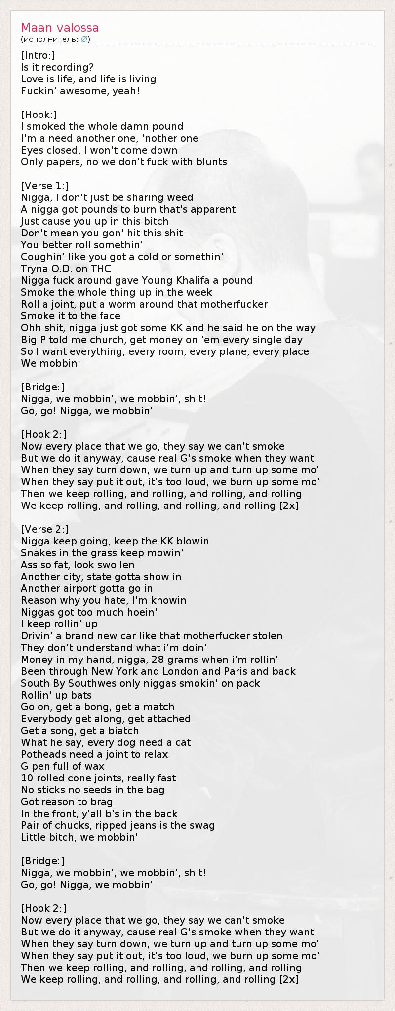 [Intro:] Is it recording? Love is life, and life is living Fuckin' awesome, yeah! [Hook:] I smoked the whole damn pound I'm a need another one, 'nother one Eyes closed, I won't come down Only papers, no we don't fuck with blunts [Verse 1:] Nigga, I don't just be sharing weed A nigga got pounds to burn that's apparent Just cause you up in this bitch Don't mean you gon' hit this shit You better roll somethin' Coughin' like you got a cold or somethin' Tryna O.D. on THC Nigga fuck around gave Young Khalifa a pound Smoke the whole thing up in the week Roll a joint, put a worm around that motherfucker Smoke it to the face Ohh shit, nigga just got some KK and he said he on the way Big P told me church, get money on 'em every single day So I want everything, every room, every plane, every place We mobbin' [Bridge:] Nigga, we mobbin', we mobbin', shit! Go, go! Nigga, we mobbin' [Hook 2:] Now every place that we go, they say we can't smoke But we do it anyway, cause real G's smoke when they want When they say turn down, we turn up and turn up some mo' When they say put it out, it's too loud, we burn up some mo' Then we keep rolling, and rolling, and rolling, and rolling We keep rolling, and rolling, and rolling, and rolling [2x] [Verse 2:] Nigga keep going, keep the KK blowin Snakes in the grass keep mowin' Ass so fat, look swollen Another city, state gotta show in Another airport gotta go in Reason why you hate, I'm knowin Niggas got too much hoein' I keep rollin' up Drivin' a brand new car like that motherfucker stolen They don't understand what i'm doin' Money in my hand, nigga, 28 grams when i'm rollin' Been through New York and London and Paris and back South By Southwes only niggas smokin' on pack Rollin' up bats Go on, get a bong, get a match Everybody get along, get attached Get a song, get a biatch What he say, every dog need a cat Potheads need a joint to relax G pen full of wax 10 rolled cone joints, really fast No sticks no seeds in the bag Got reason to brag In the front, y'all b's in the back Pair of chucks, ripped jeans is the swag Little bitch, we mobbin' [Bridge:] Nigga, we mobbin', we mobbin', shit! Go, go! Nigga, we mobbin' [Hook 2:] Now every place that we go, they say we can't smoke But we do it anyway, cause real G's smoke when they want When they say turn down, we turn up and turn up some mo' When they say put it out, it's too loud, we burn up some mo' Then we keep rolling, and rolling, and rolling, and rolling We keep rolling, and rolling, and rolling, and rolling [2x]