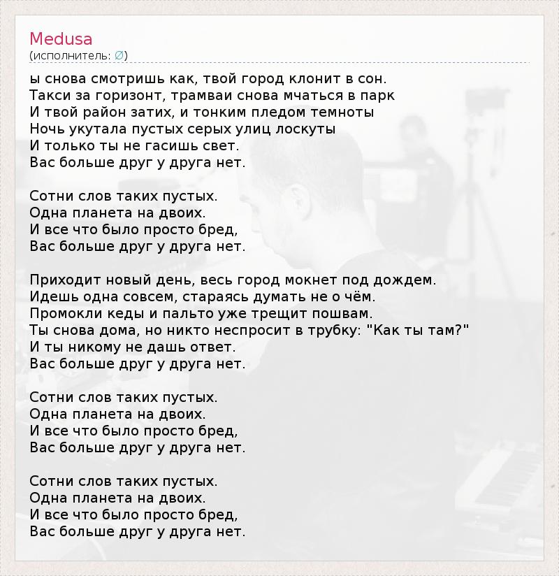 ы снова смотришь как, твой город клонит в сон. Такси за горизонт, трамваи снова мчаться в парк И твой район затих, и тонким пледом темноты Ночь укутала пустых серых улиц лоскуты И только ты не гасишь свет. Вас больше друг у друга нет. Сотни слов таких пустых. Одна планета на двоих. И все что было просто бред, Вас больше друг у друга нет. Приходит новый день, весь город мокнет под дождем. Идешь одна совсем, стараясь думать не о чём. Промокли кеды и пальто уже трещит пошвам. Ты снова дома, но никто неспросит в трубку: "Как ты там?" И ты никому не дашь ответ. Вас больше друг у друга нет. Сотни слов таких пустых. Одна планета на двоих. И все что было просто бред, Вас больше друг у друга нет. Сотни слов таких пустых. Одна планета на двоих. И все что было просто бред, Вас больше друг у друга нет.