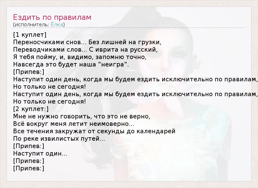 [1 куплет] Переносчиками снов... Без лишней на грузки, Переводчиками слов... С иврита на русский, Я тебя пойму, и, видимо, запомню точно, Навсегда это будет наша "неигра". [Припев:] Наступит один день, когда мы будем ездить исключительно по правилам, Но только не сегодня! Наступит один день, когда мы будем ездить исключительно по правилам, Но только не сегодня! [2 куплет:] Мне не нужно говорить, что это не верно, Всё вокруг меня летит неимоверно... Все течения закружат от секунды до календарей По реке извилистых путей... [Припев:] Наступит один... [Припев:] [Припев:]