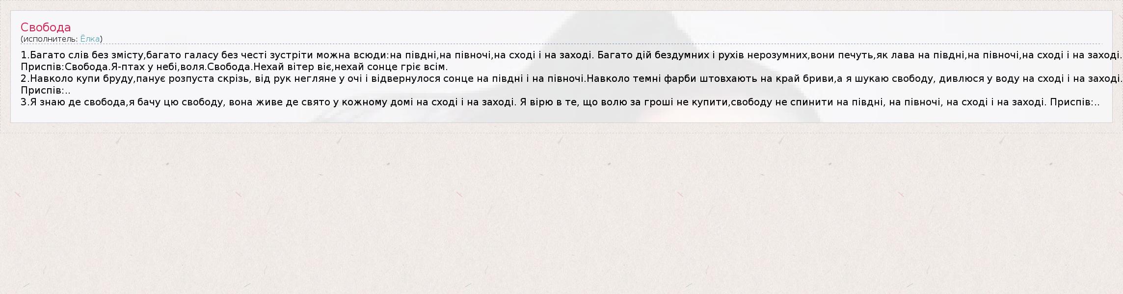 1.Багато слів без змісту,багато галасу без честі зустріти можна всюди:на півднi,на півночі,на сході і на заході. Багато дій бездумних і рухів нерозумних,вони печуть,як лава на півднi,на півночі,на сході і на заході. Приспів:Свобода.Я-птах у небі,воля.Свобода.Нехай вiтер віє,нехай сонце гріє всім. 2.Навколо купи бруду,панує розпуста скрізь, від рук негляне у очі і відвернулося сонце на півднi і на півночі.Навколо темні фарби штовхають на край бриви,а я шукаю свободу, дивлюся у воду на сході і на заході. Приспів:.. 3.Я знаю де свобода,я бачу цю свободу, вона живе де свято у кожному домi на сході і на заході. Я вірю в те, що волю за гроші не купити,свободу не спинити на півднi, на півночі, на сході і на заході. Приспів:..