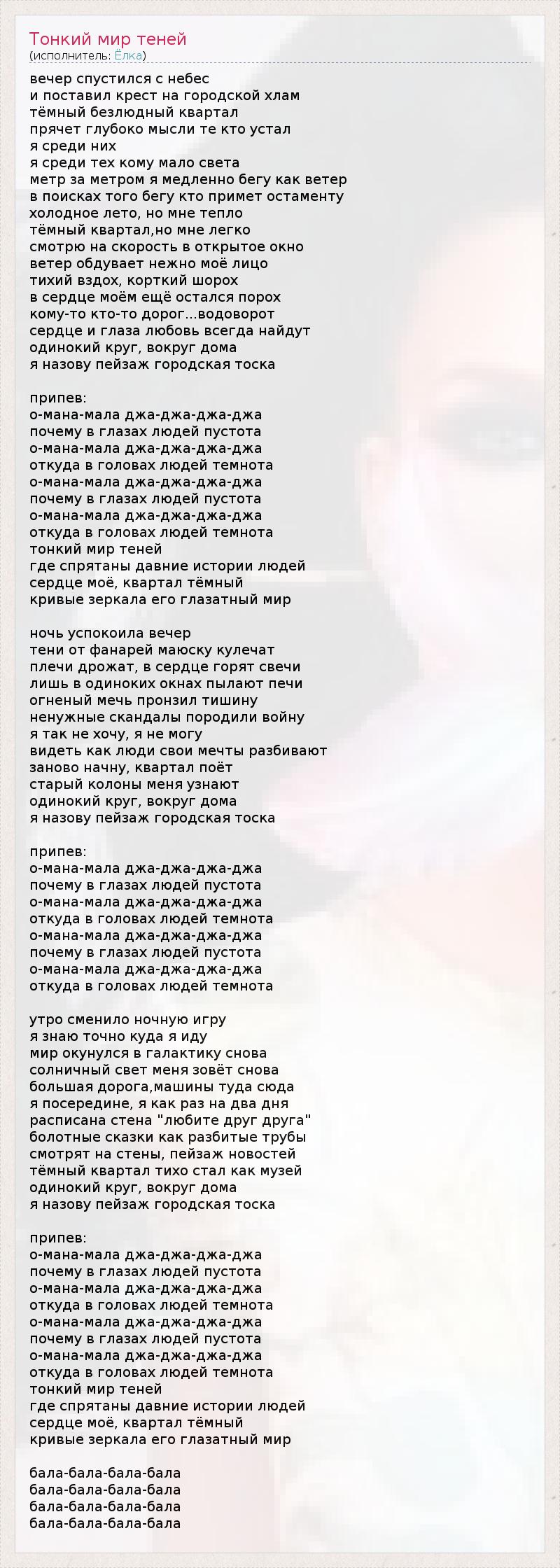 вечер спустился с небес и поставил крест на городской хлам тёмный безлюдный квартал прячет глубоко мысли те кто устал я среди них я среди тех кому мало света метр за метром я медленно бегу как ветер в поисках того бегу кто примет остаменту холодное лето, но мне тепло тёмный квартал,но мне легко смотрю на скорость в открытое окно ветер обдувает нежно моё лицо тихий вздох, корткий шорох в сердце моём ещё остался порох кому-то кто-то дорог...водоворот сердце и глаза любовь всегда найдут одинокий круг, вокруг дома я назову пейзаж городская тоска припев: о-мана-мала джа-джа-джа-джа почему в глазах людей пустота о-мана-мала джа-джа-джа-джа откуда в головах людей темнота о-мана-мала джа-джа-джа-джа почему в глазах людей пустота о-мана-мала джа-джа-джа-джа откуда в головах людей темнота тонкий мир теней где спрятаны давние истории людей сердце моё, квартал тёмный кривые зеркала его глазатный мир ночь успокоила вечер тени от фанарей маюску кулечат плечи дрожат, в сердце горят свечи лишь в одиноких окнах пылают печи огненый мечь пронзил тишину ненужные скандалы породили войну я так не хочу, я не могу видеть как люди свои мечты разбивают заново начну, квартал поёт старый колоны меня узнают одинокий круг, вокруг дома я назову пейзаж городская тоска припев: о-мана-мала джа-джа-джа-джа почему в глазах людей пустота о-мана-мала джа-джа-джа-джа откуда в головах людей темнота о-мана-мала джа-джа-джа-джа почему в глазах людей пустота о-мана-мала джа-джа-джа-джа откуда в головах людей темнота утро сменило ночную игру я знаю точно куда я иду мир окунулся в галактику снова солничный свет меня зовёт снова большая дорога,машины туда сюда я посередине, я как раз на два дня расписана стена "любите друг друга" болотные сказки как разбитые трубы смотрят на стены, пейзаж новостей тёмный квартал тихо стал как музей одинокий круг, вокруг дома я назову пейзаж городская тоска припев: о-мана-мала джа-джа-джа-джа почему в глазах людей пустота о-мана-мала джа-джа-джа-джа откуда в головах людей темнота о-мана-мала джа-джа-джа-джа почему в глазах людей пустота о-мана-мала джа-джа-джа-джа откуда в головах людей темнота тонкий мир теней где спрятаны давние истории людей сердце моё, квартал тёмный кривые зеркала его глазатный мир бала-бала-бала-бала бала-бала-бала-бала бала-бала-бала-бала бала-бала-бала-бала