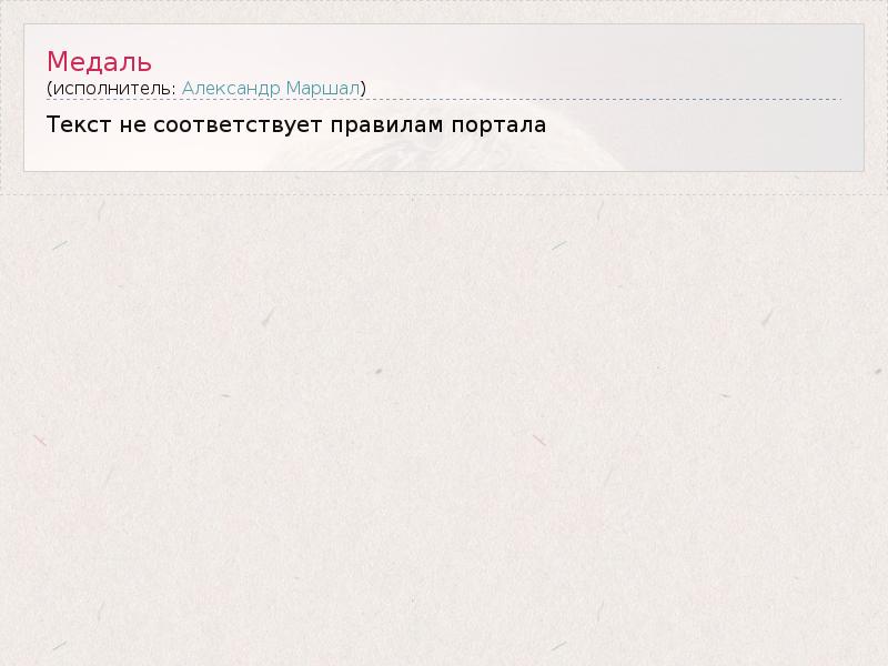 Beamed with joy correspondent Snow fell , rapidly melting , on the road Shifting all the special contingent Found medal Trofimov earrings Stood by the company officer on the parade ground On the contrary people are strict in uniform A tear rolled down the face with water Found medal Trofimov earrings A tear rolled down the face with water Found medal Trofimov earrings And in the past two Chechen and Afghan And wounds there on fire roads What he hell brothers urkagan Trofimov forty years Serge His boss politely praised But his voice was audible alarm And he's only in the cells left Trofimov forty years Serge A tower rose up time Do not need pictures , for God's sake Now would be two programs for frontline Found medal Trofimov earrings Now would be two programs for frontline Found medal Trofimov earrings