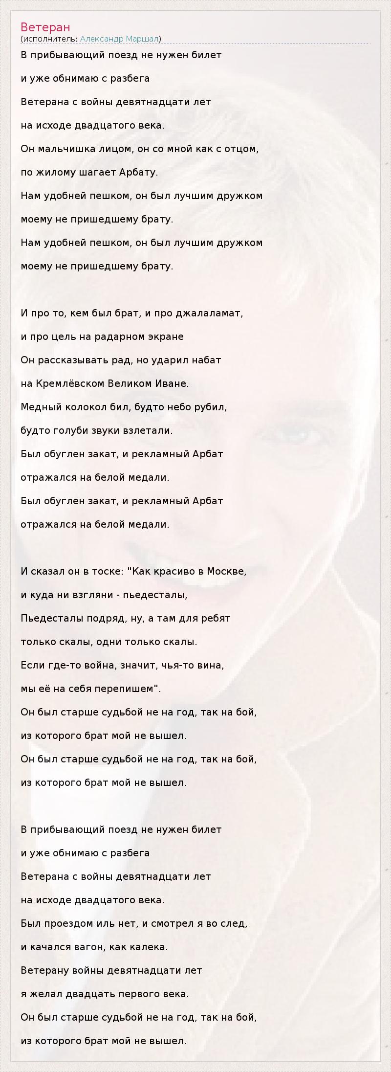 Это интересно:Александр Маршал - по паспорту Александр Витальевич Миньков - родился 7 июня 1957 г. в городе Кореновске Краснодарского края. В начале 80-х годов переехал в Москву, где вскоре начал сотрудничать с продюсером Стасом Наминым. В 1987-м году переходит в российскую рок-группу "Парк Горького", меняя на позиции вокалиста Николая Носкова, и переезжает вместе с ней в США. В конце 1998-го покидает... продолжение