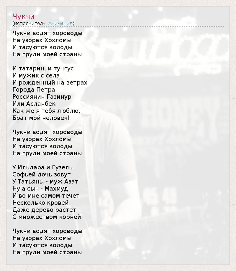 Чукчи водят хороводы На узорах Хохломы И тасуются колоды На груди моей страны И татарин, и тунгус И мужик с села И рожденный на ветрах Города Петра Россиянин Газинур Или Асланбек Как же я тебя люблю, Брат мой человек! Чукчи водят хороводы На узорах Хохломы И тасуются колоды На груди моей страны У Ильдара и Гузель Софьей дочь зовут У Татьяны - муж Азат Ну а сын - Махмуд И во мне самом течет Несколько кровей Даже дерево растет С множеством корней Чукчи водят хороводы На узорах Хохломы И тасуются колоды На груди моей страны