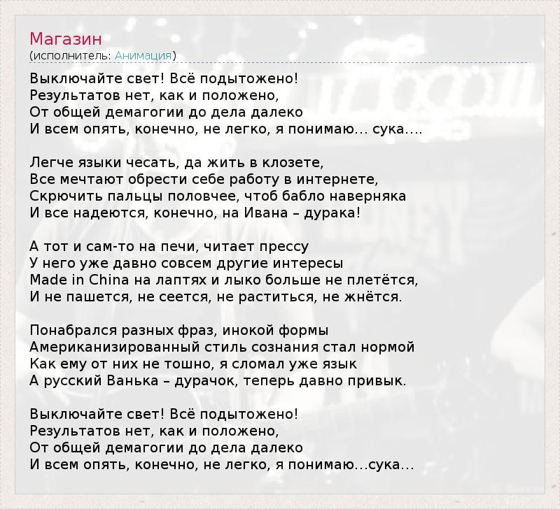 Выключайте свет! Всё подытожено! Результатов нет, как и положено, От общей демагогии до дела далеко И всем опять, конечно, не легко, я понимаю… сука…. Легче языки чесать, да жить в клозете, Все мечтают обрести себе работу в интернете, Скрючить пальцы половчее, чтоб бабло наверняка И все надеются, конечно, на Ивана – дурака! А тот и сам-то на печи, читает прессу У него уже давно совсем другие интересы Made in China на лаптях и лыко больше не плетётся, И не пашется, не сеется, не раститься, не жнётся. Понабрался разных фраз, инокой формы Американизированный стиль сознания стал нормой Как ему от них не тошно, я сломал уже язык А русский Ванька – дурачок, теперь давно привык. Выключайте свет! Всё подытожено! Результатов нет, как и положено, От общей демагогии до дела далеко И всем опять, конечно, не легко, я понимаю…сука…