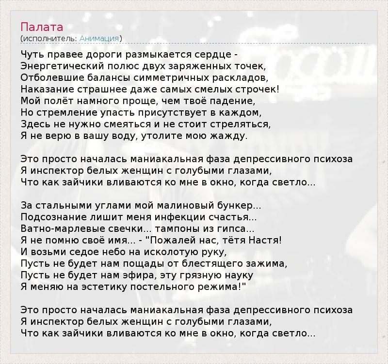 Чуть правее дороги размыкается сердце - Энергетический полюс двух заряженных точек, Отболевшие балансы симметричных раскладов, Наказание страшнее даже самых смелых строчек! Мой полёт намного проще, чем твоё падение, Но стремление упасть присутствует в каждом, Здесь не нужно смеяться и не стоит стреляться, Я не верю в вашу воду, утолите мою жажду. Это просто началась маниакальная фаза депрессивного психоза Я инспектор белых женщин с голубыми глазами, Что как зайчики вливаются ко мне в окно, когда светло... За стальными углами мой малиновый бункер... Подсознание лишит меня инфекции счастья... Ватно-марлевые свечки... тампоны из гипса... Я не помню своё имя... - "Пожалей нас, тётя Настя! И возьми седое небо на исколотую руку, Пусть не будет нам пощады от блестящего зажима, Пусть не будет нам эфира, эту грязную науку Я меняю на эстетику постельного режима!" Это просто началась маниакальная фаза депрессивного психоза Я инспектор белых женщин с голубыми глазами, Что как зайчики вливаются ко мне в окно, когда светло...