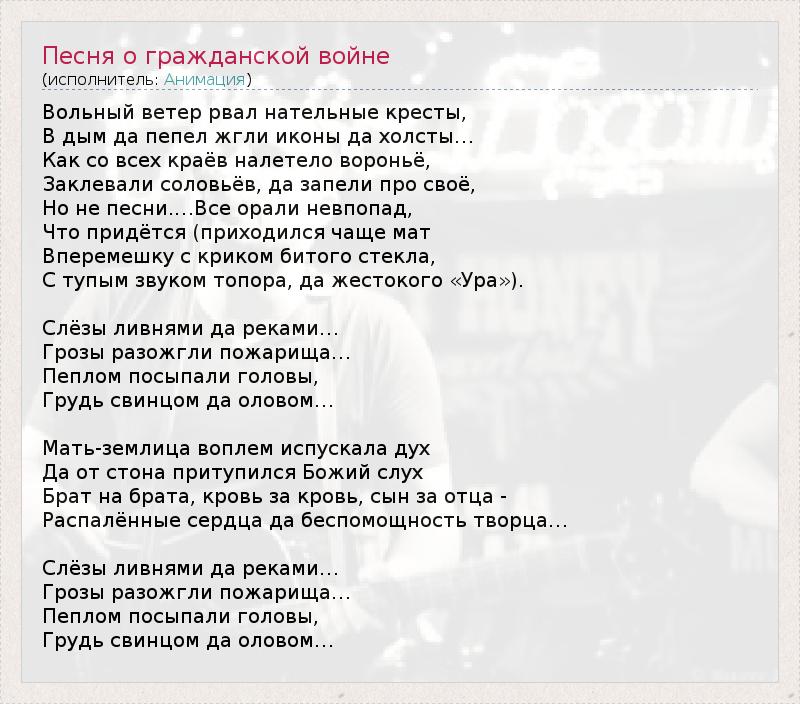 Вольный ветер рвал нательные кресты, В дым да пепел жгли иконы да холсты… Как со всех краёв налетело вороньё, Заклевали соловьёв, да запели про своё, Но не песни.…Все орали невпопад, Что придётся (приходился чаще мат Вперемешку с криком битого стекла, С тупым звуком топора, да жестокого «Ура»). Слёзы ливнями да реками… Грозы разожгли пожарища… Пеплом посыпали головы, Грудь свинцом да оловом… Мать-землица воплем испускала дух Да от стона притупился Божий слух Брат на брата, кровь за кровь, сын за отца - Распалённые сердца да беспомощность творца… Слёзы ливнями да реками… Грозы разожгли пожарища… Пеплом посыпали головы, Грудь свинцом да оловом…