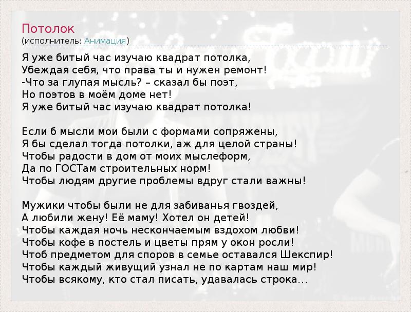 Я уже битый час изучаю квадрат потолка, Убеждая себя, что права ты и нужен ремонт! -Что за глупая мысль? – сказал бы поэт, Но поэтов в моём доме нет! Я уже битый час изучаю квадрат потолка! Если б мысли мои были с формами сопряжены, Я бы сделал тогда потолки, аж для целой страны! Чтобы радости в дом от моих мыслеформ, Да по ГОСТам строительных норм! Чтобы людям другие проблемы вдруг стали важны! Мужики чтобы были не для забиванья гвоздей, А любили жену! Eё маму! Хотел он детей! Чтобы каждая ночь нескончаемым вздохом любви! Чтобы кофе в постель и цветы прям у окон росли! Чтоб предметом для споров в семье оставался Шекспир! Чтобы каждый живущий узнал не по картам наш мир! Чтобы всякому, кто стал писать, удавалась строка…