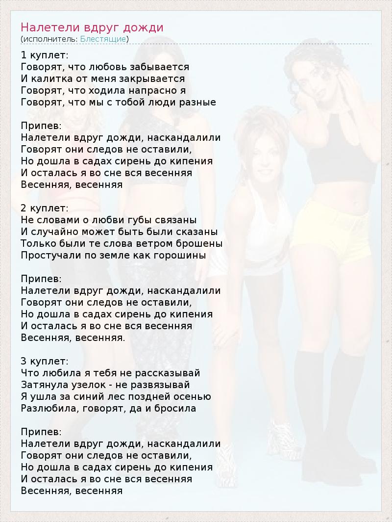 1 куплет: Говорят, что любовь забывается И калитка от меня закрывается Говорят, что ходила напрасно я Говорят, что мы с тобой люди разные Припев: Налетели вдруг дожди, наскандалили Говорят они следов не оставили, Но дошла в садах сирень до кипения И осталась я во сне вся весенняя Весенняя, весенняя 2 куплет: Не словами о любви губы связаны И случайно может быть были сказаны Только были те слова ветром брошены Простучали по земле как горошины Припев: Налетели вдруг дожди, наскандалили Говорят они следов не оставили, Но дошла в садах сирень до кипения И осталась я во сне вся весенняя Весенняя, весенняя. 3 куплет: Что любила я тебя не рассказывай Затянула узелок - не развязывай Я ушла за синий лес поздней осенью Разлюбила, говорят, да и бросила Припев: Налетели вдруг дожди, наскандалили Говорят они следов не оставили, Но дошла в садах сирень до кипения И осталась я во сне вся весенняя Весенняя, весенняя