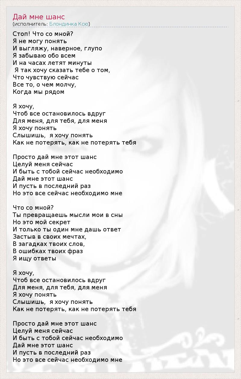Стоп! Что со мной? Я не могу понять И выгляжу, наверное, глупо Я забываю обо всем И на часах летят минуты Я так хочу сказать тебе о том, Что чувствую сейчас Все то, о чем молчу, Когда мы рядом Я хочу, Чтоб все остановилось вдруг Для меня, для тебя, для меня Я хочу понять Слышишь, я хочу понять Как не потерять, как не потерять тебя Просто дай мне этот шанс Целуй меня сейчас И быть с тобой сейчас необходимо Дай мне этот шанс И пусть в последний раз Но это все сейчас необходимо мне Что со мной? Ты превращаешь мысли мои в сны Но это мой секрет И только ты один мне дашь ответ Застыв в своих мечтах, В загадках твоих слов, В ошибках твоих фраз Я ищу ответы Я хочу, Чтоб все остановилось вдруг Для меня, для тебя, для меня Я хочу понять Слышишь, я хочу понять Как не потерять, как не потерять тебя Просто дай мне этот шанс Целуй меня сейчас И быть с тобой сейчас необходимо Дай мне этот шанс И пусть в последний раз Но это все сейчас необходимо мне