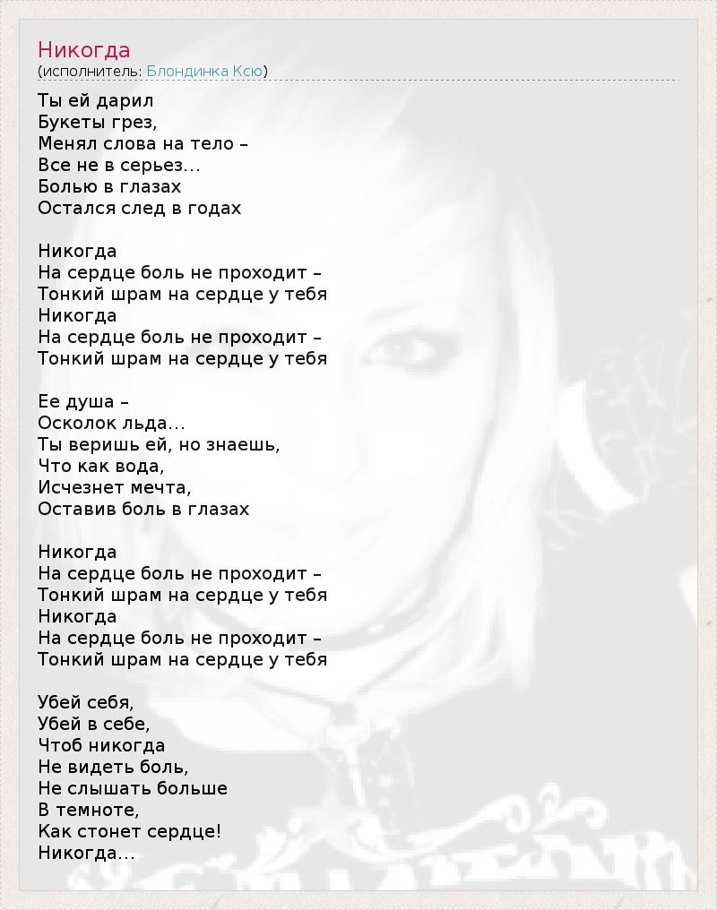 Это интересно:Блондинка КсЮ (настоящее имя — Ксения Сидорина) - cекс-символ рока (по оценке журнала "Роллинг Стоун") и одна из ведущих певиц отечественной рок-сцены. Блондинка КсЮ выпускает свой новый, второй по счету альбом – «Время все разрушает». КсЮ родилась 21 августа, 1982 года в городе Горьком в семье архитекторов. Когда ей исполнилось 2 года, они всей семьей переехали на землю Тульскую, на... продолжение