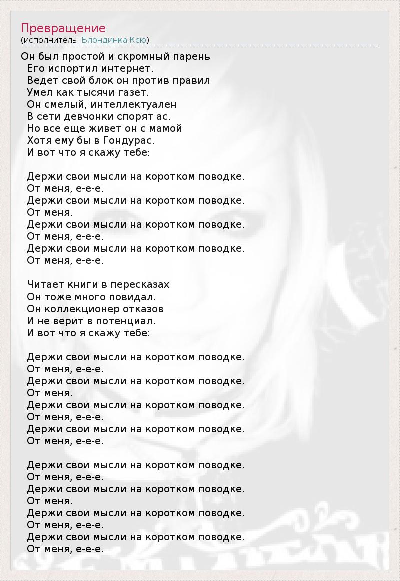Это интересно:Блондинка КсЮ (настоящее имя — Ксения Сидорина) - cекс-символ рока (по оценке журнала "Роллинг Стоун") и одна из ведущих певиц отечественной рок-сцены. Блондинка КсЮ выпускает свой новый, второй по счету альбом – «Время все разрушает». КсЮ родилась 21 августа, 1982 года в городе Горьком в семье архитекторов. Когда ей исполнилось 2 года, они всей семьей переехали на землю Тульскую, на... продолжение
