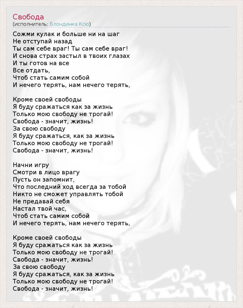 Сожми кулак и больше ни на шаг Не отступай назад Ты сам себе враг! Ты сам себе враг! И снова страх застыл в твоих глазах И ты готов на все Все отдать, Чтоб стать самим собой И нечего терять, нам нечего терять, Кроме своей свободы Я буду сражаться как за жизнь Только мою свободу не трогай! Свобода - значит, жизнь! За свою свободу Я буду сражаться, как за жизнь Только мою свободу не трогай! Свобода - значит, жизнь! Начни игру Смотри в лицо врагу Пусть он запомнит, Что последний ход всегда за тобой Никто не сможет управлять тобой Не предавай себя Настал твой час, Чтоб стать самим собой И нечего терять, нам нечего терять, Кроме своей свободы Я буду сражаться как за жизнь Только мою свободу не трогай! Свобода - значит, жизнь! За свою свободу Я буду сражаться, как за жизнь Только мою свободу не трогай! Свобода - значит, жизнь!
