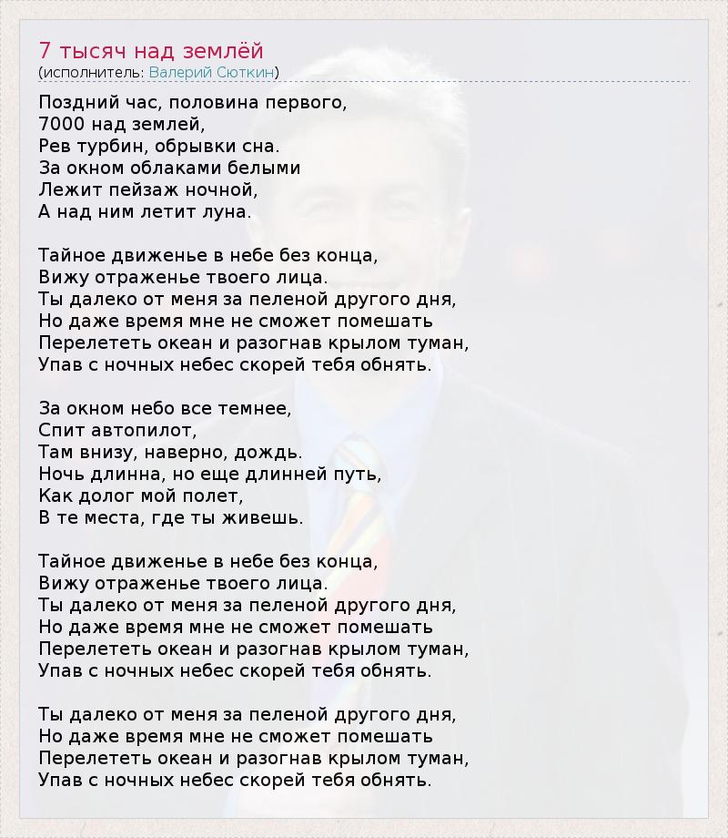 Поздний час, половина первого, 7000 над землей, Рев турбин, обрывки сна. За окном облаками белыми Лежит пейзаж ночной, А над ним летит луна. Тайное движенье в небе без конца, Вижу отраженье твоего лица. Ты далеко от меня за пеленой другого дня, Но даже время мне не сможет помешать Перелететь океан и разогнав крылом туман, Упав с ночных небес скорей тебя обнять. За окном небо все темнее, Спит автопилот, Там внизу, наверно, дождь. Ночь длинна, но еще длинней путь, Как долог мой полет, В те места, где ты живешь. Тайное движенье в небе без конца, Вижу отраженье твоего лица. Ты далеко от меня за пеленой другого дня, Но даже время мне не сможет помешать Перелететь океан и разогнав крылом туман, Упав с ночных небес скорей тебя обнять. Ты далеко от меня за пеленой другого дня, Но даже время мне не сможет помешать Перелететь океан и разогнав крылом туман, Упав с ночных небес скорей тебя обнять.