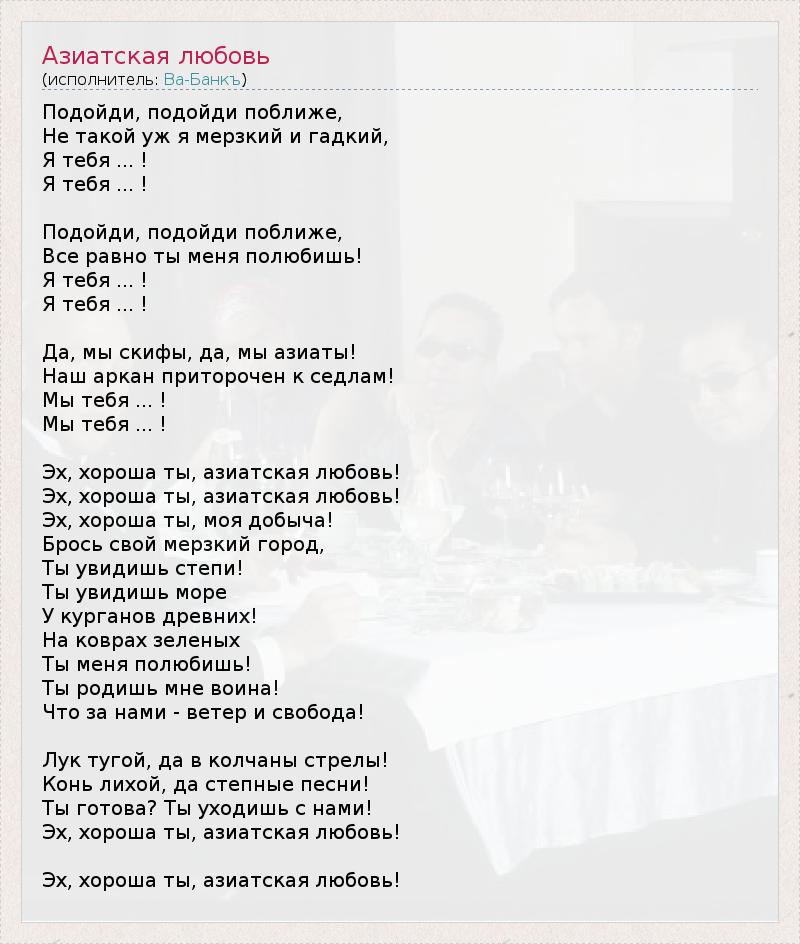 Подойди, подойди поближе, Не такой уж я мерзкий и гадкий, Я тебя ... ! Я тебя ... ! Подойди, подойди поближе, Все равно ты меня полюбишь! Я тебя ... ! Я тебя ... ! Да, мы скифы, да, мы азиаты! Наш аркан приторочен к седлам! Мы тебя ... ! Мы тебя ... ! Эх, хороша ты, азиатская любовь! Эх, хороша ты, азиатская любовь! Эх, хороша ты, моя добыча! Брось свой мерзкий город, Ты увидишь степи! Ты увидишь море У курганов древних! На коврах зеленых Ты меня полюбишь! Ты родишь мне воина! Что за нами - ветер и свобода! Лук тугой, да в колчаны стрелы! Конь лихой, да степные песни! Ты готова? Ты уходишь с нами! Эх, хороша ты, азиатская любовь! Эх, хороша ты, азиатская любовь!