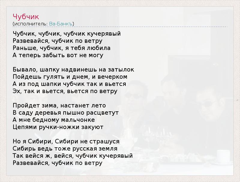 Чубчик, чубчик, чубчик кучерявый Развевайся, чубчик по ветру Раньше, чубчик, я тебя любила А теперь забыть вот не могу Бывало, шапку надвинешь на затылок Пойдешь гулять и днем, и вечерком А из под шапки чубчик так и вьется Эх, так и вьется, вьется по ветру Пройдет зима, настанет лето В саду деревья пышно расцветут А мне бедному мальчонке Цепями ручки-ножки закуют Но я Сибири, Сибири не страшуся Сибирь ведь тоже русская земля Так вейся ж, вейся, чубчик кучерявый Развевайся, чубчик по ветру