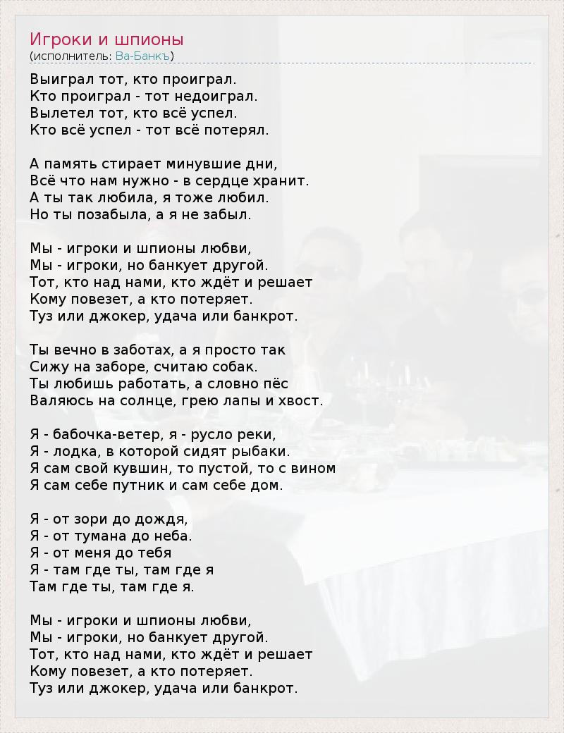 Выиграл тот, кто проиграл. Кто проиграл - тот недоиграл. Вылетел тот, кто всё успел. Кто всё успел - тот всё потерял. А память стирает минувшие дни, Всё что нам нужно - в сердце хранит. А ты так любила, я тоже любил. Но ты позабыла, а я не забыл. Мы - игроки и шпионы любви, Мы - игроки, но банкует другой. Тот, кто над нами, кто ждёт и решает Кому повезет, а кто потеряет. Туз или джокер, удача или банкрот. Ты вечно в заботах, а я просто так Сижу на заборе, считаю собак. Ты любишь работать, а словно пёс Валяюсь на солнце, грею лапы и хвост. Я - бабочка-ветер, я - русло реки, Я - лодка, в которой сидят рыбаки. Я сам свой кувшин, то пустой, то с вином Я сам себе путник и сам себе дом. Я - от зори до дождя, Я - от тумана до неба. Я - от меня до тебя Я - там где ты, там где я Там где ты, там где я. Мы - игроки и шпионы любви, Мы - игроки, но банкует другой. Тот, кто над нами, кто ждёт и решает Кому повезет, а кто потеряет. Туз или джокер, удача или банкрот.