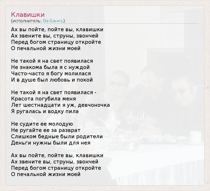 Ах вы пойте, пойте вы, клавишки Ах звените вы, струны, звончей Перед богом страницу откройте О печальной жизни моей Не такой я на свет появилася Не знакома была я с нуждой Часто-часто я богу молилася И в душе был любовь и покой Не такой я на свет появилася - Красота погубила меня Лет шестнадцати я уж, девчоночка Я ругалась и водку пила Не судите ее молодую Не ругайте ее за разврат Слишком бедные были родители Деньги нужны были для нея Ах вы пойте, пойте вы, клавишки Ах звените вы, струны, звончей Перед богом страницу откройте О печальной жизни моей