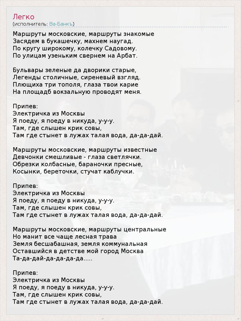 Маршруты московские, маршруты знакомые Засядем в букашечку, махнем наугад. По кругу широкому, колечку Садовому. По улицам узеньким свернем на Арбат. Бульвары зеленые да дворики старые, Легенды столичные, сиреневый взгляд. Плющиха три тополя, глаза твои карие На площадб вокзальную проводят меня. Припев: Электричка из Москвы Я поеду, я поеду в никуда, у-у-у. Там, где слышен крик совы, Там где стынет в лужах талая вода, да-да-дай. Маршруты московские, маршруты известные Девчонки смешливые - глаза светлячки. Обрезки колбасные, бараночки пресные, Косынки, береточки, стучат каблучки. Припев: Электричка из Москвы Я поеду, я поеду в никуда, у-у-у. Там, где слышен крик совы, Там где стынет в лужах талая вода, да-да-дай. Маршруты московские, маршруты центральные Но манит все чаще лесная трава Земля бесшабашная, земля коммунальная Оставшийся в детстве мой город Москва Та-да-дай-да-да-да-да..... Припев: Электричка из Москвы Я поеду, я поеду в никуда, у-у-у. Там, где слышен крик совы, Там где стынет в лужах талая вода, да-да-дай.