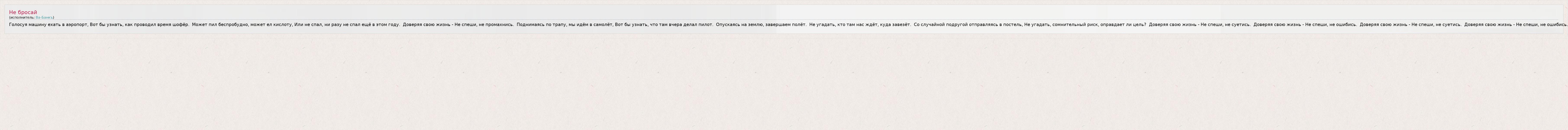 Голосуя машину ехать в аэропорт, Вот бы узнать, как проводил время шофёр. Может пил беспробудно, может ел кислоту, Или не спал, ни разу не спал ещё в этом году. Доверяя свою жизнь - Не спеши, не промахнись. Поднимаясь по трапу, мы идём в самолёт, Вот бы узнать, что там вчера делал пилот. Опускаясь на землю, завершаем полёт. Не угадать, кто там нас ждёт, куда завезёт. Со случайной подругой отправляясь в постель, Не угадать, сомнительный риск, оправдает ли цель? Доверяя свою жизнь - Не спеши, не суетись. Доверяя свою жизнь - Не спеши, не ошибись. Доверяя свою жизнь - Не спеши, не суетись. Доверяя свою жизнь - Не спеши, не ошибись.