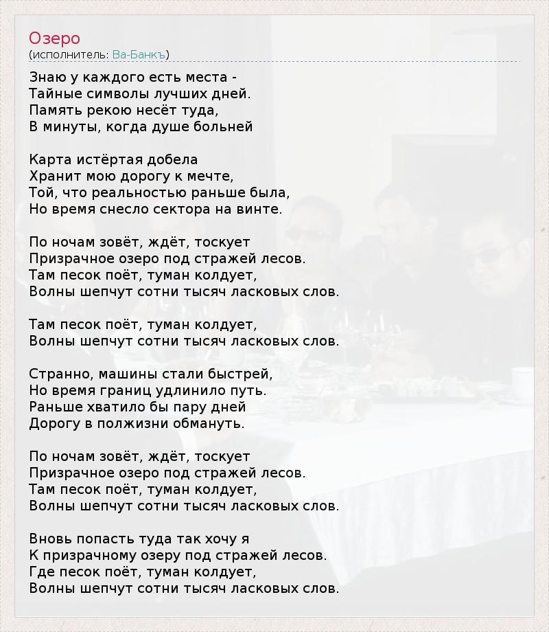 Знаю у каждого есть места - Тайные символы лучших дней. Память рекою несёт туда, В минуты, когда душе больней Карта истёртая добела Хранит мою дорогу к мечте, Той, что реальностью раньше была, Но время снесло сектора на винте. По ночам зовёт, ждёт, тоскует Призрачное озеро под стражей лесов. Там песок поёт, туман колдует, Волны шепчут сотни тысяч ласковых слов. Там песок поёт, туман колдует, Волны шепчут сотни тысяч ласковых слов. Странно, машины стали быстрей, Но время границ удлинило путь. Раньше хватило бы пару дней Дорогу в полжизни обмануть. По ночам зовёт, ждёт, тоскует Призрачное озеро под стражей лесов. Там песок поёт, туман колдует, Волны шепчут сотни тысяч ласковых слов. Вновь попасть туда так хочу я К призрачному озеру под стражей лесов. Где песок поёт, туман колдует, Волны шепчут сотни тысяч ласковых слов.