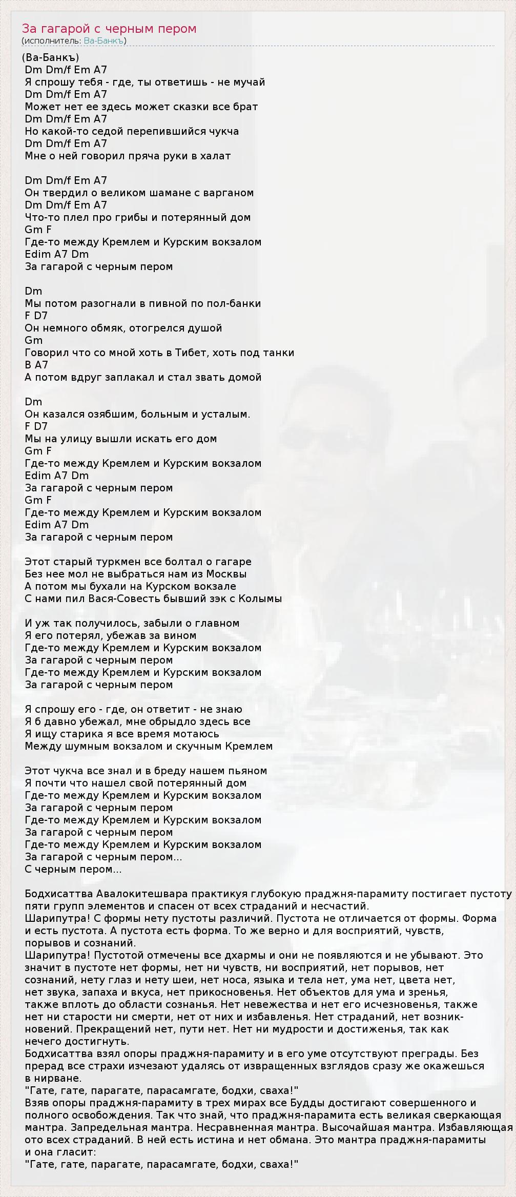 (Ва-Банкъ) Dm Dm/f Em A7 Я спрошу тебя - где, ты ответишь - не мучай Dm Dm/f Em A7 Может нет ее здесь может сказки все брат Dm Dm/f Em A7 Но какой-то седой перепившийся чукча Dm Dm/f Em A7 Мне о ней говорил пряча руки в халат Dm Dm/f Em A7 Он твердил о великом шамане с варганом Dm Dm/f Em A7 Что-то плел про грибы и потерянный дом Gm F Где-то между Кремлем и Курским вокзалом Edim A7 Dm За гагарой с черным пером Dm Мы потом разогнали в пивной по пол-банки F D7 Он немного обмяк, отогрелся душой Gm Говорил что со мной хоть в Тибет, хоть под танки B A7 А потом вдруг заплакал и стал звать домой Dm Он казался озябшим, больным и усталым. F D7 Мы на улицу вышли искать его дом Gm F Где-то между Кремлем и Курским вокзалом Edim A7 Dm За гагарой с черным пером Gm F Где-то между Кремлем и Курским вокзалом Edim A7 Dm За гагарой с черным пером Этот старый туркмен все болтал о гагаре Без нее мол не выбраться нам из Москвы А потом мы бухали на Курском вокзале С нами пил Вася-Совесть бывший зэк с Колымы И уж так получилось, забыли о главном Я его потерял, убежав за вином Где-то между Кремлем и Курским вокзалом За гагарой с черным пером Где-то между Кремлем и Курским вокзалом За гагарой с черным пером Я спрошу его - где, он ответит - не знаю Я б давно убежал, мне обрыдло здесь все Я ищу старика я все время мотаюсь Между шумным вокзалом и скучным Кремлем Этот чукча все знал и в бреду нашем пьяном Я почти что нашел свой потерянный дом Где-то между Кремлем и Курским вокзалом За гагарой с черным пером Где-то между Кремлем и Курским вокзалом За гагарой с черным пером Где-то между Кремлем и Курским вокзалом За гагарой с черным пером... С черным пером... Бодхисаттва Авалокитешвара практикуя глубокую праджня-парамиту постигает пустоту пяти групп элементов и спасен от всех страданий и несчастий. Шарипутра! С формы нету пустоты различий. Пустота не отличается от формы. Форма и есть пустота. А пустота есть форма. То же верно и для восприятий, чувств, порывов и сознаний. Шарипутра! Пустотой отмечены все дхармы и они не появляются и не убывают. Это значит в пустоте нет формы, нет ни чувств, ни восприятий, нет порывов, нет сознаний, нету глаз и нету шеи, нет носа, языка и тела нет, ума нет, цвета нет, нет звука, запаха и вкуса, нет прикосновенья. Нет объектов для ума и зренья, также вплоть до области сознанья. Нет невежества и нет его исчезновенья, также нет ни старости ни смерти, нет от них и избавленья. Нет страданий, нет возник- новений. Прекращений нет, пути нет. Нет ни мудрости и достиженья, так как нечего достигнуть. Бодхисаттва взял опоры праджня-парамиту и в его уме отсутствуют преграды. Без прерад все страхи изчезают удалясь от извращенных взглядов сразу же окажешься в нирване. "Гате, гате, парагате, парасамгате, бодхи, сваха!" Взяв опоры праджня-парамиту в трех мирах все Будды достигают совершенного и полного освобождения. Так что знай, что праджня-парамита есть великая сверкающая мантра. Запредельная мантра. Несравненная мантра. Высочайшая мантра. Избавляющая ото всех страданий. В ней есть истина и нет обмана. Это мантра праджня-парамиты и она гласит: "Гате, гате, парагате, парасамгате, бодхи, сваха!"