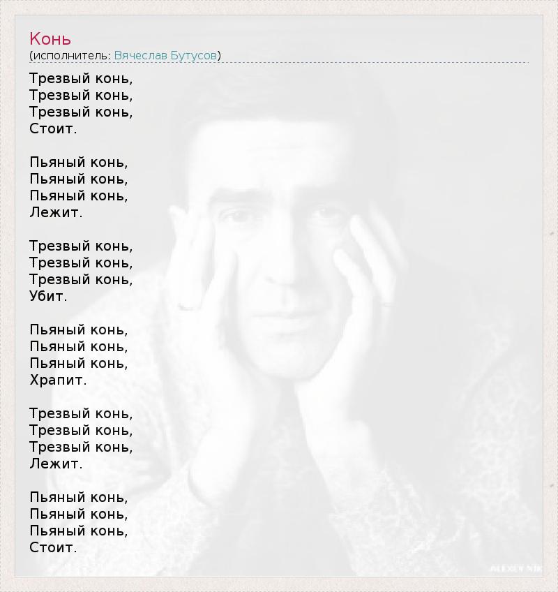 Трезвый конь, Трезвый конь, Трезвый конь, Стоит. Пьяный конь, Пьяный конь, Пьяный конь, Лежит. Трезвый конь, Трезвый конь, Трезвый конь, Убит. Пьяный конь, Пьяный конь, Пьяный конь, Храпит. Трезвый конь, Трезвый конь, Трезвый конь, Лежит. Пьяный конь, Пьяный конь, Пьяный конь, Стоит.