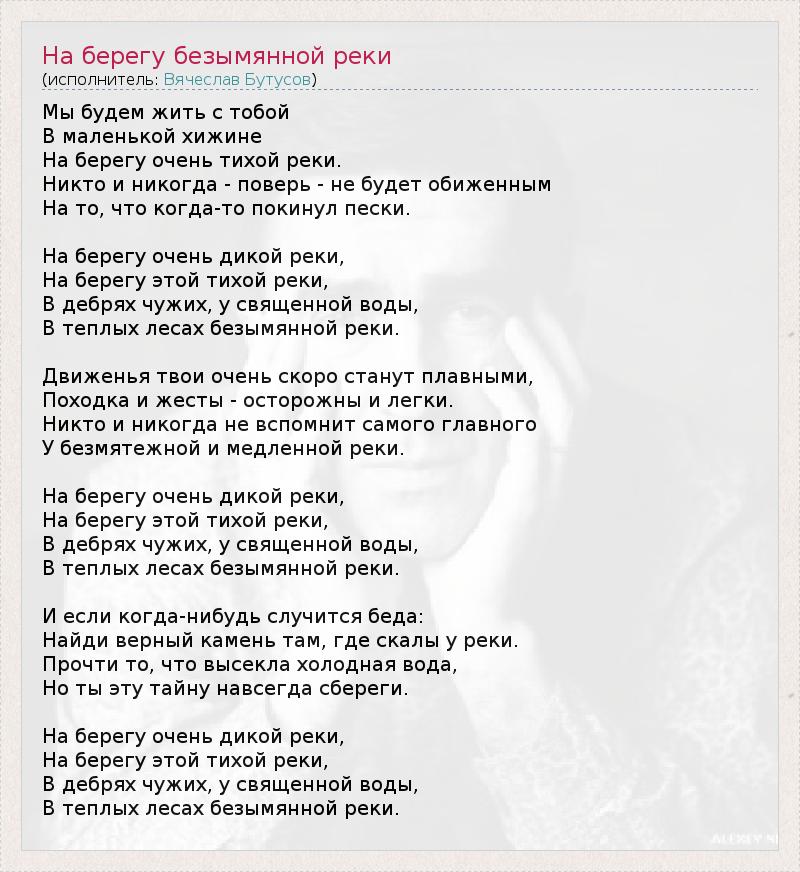 Мы будем жить с тобой В маленькой хижине На берегу очень тихой реки. Никто и никогда - поверь - не будет обиженным На то, что когда-то покинул пески. На берегу очень дикой реки, На берегу этой тихой реки, В дебрях чужих, у священной воды, В теплых лесах безымянной реки. Движенья твои очень скоро станут плавными, Походка и жесты - осторожны и легки. Никто и никогда не вспомнит самого главного У безмятежной и медленной реки. На берегу очень дикой реки, На берегу этой тихой реки, В дебрях чужих, у священной воды, В теплых лесах безымянной реки. И если когда-нибудь случится беда: Найди верный камень там, где скалы у реки. Прочти то, что высекла холодная вода, Но ты эту тайну навсегда сбереги. На берегу очень дикой реки, На берегу этой тихой реки, В дебрях чужих, у священной воды, В теплых лесах безымянной реки.