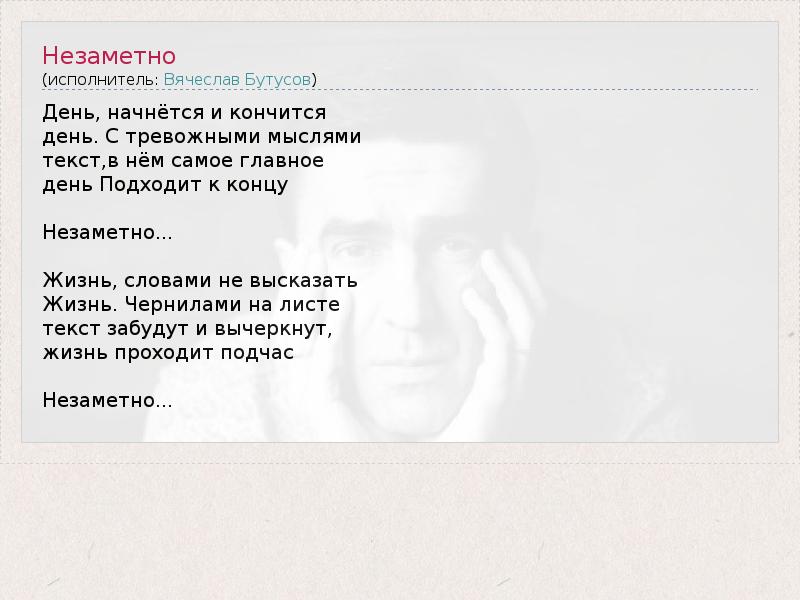 День, начнётся и кончится день. С тревожными мыслями текст,в нём самое главное день Подходит к концу Незаметно... Жизнь, словами не высказать Жизнь. Чернилами на листе текст забудут и вычеркнут, жизнь проходит подчас Незаметно...