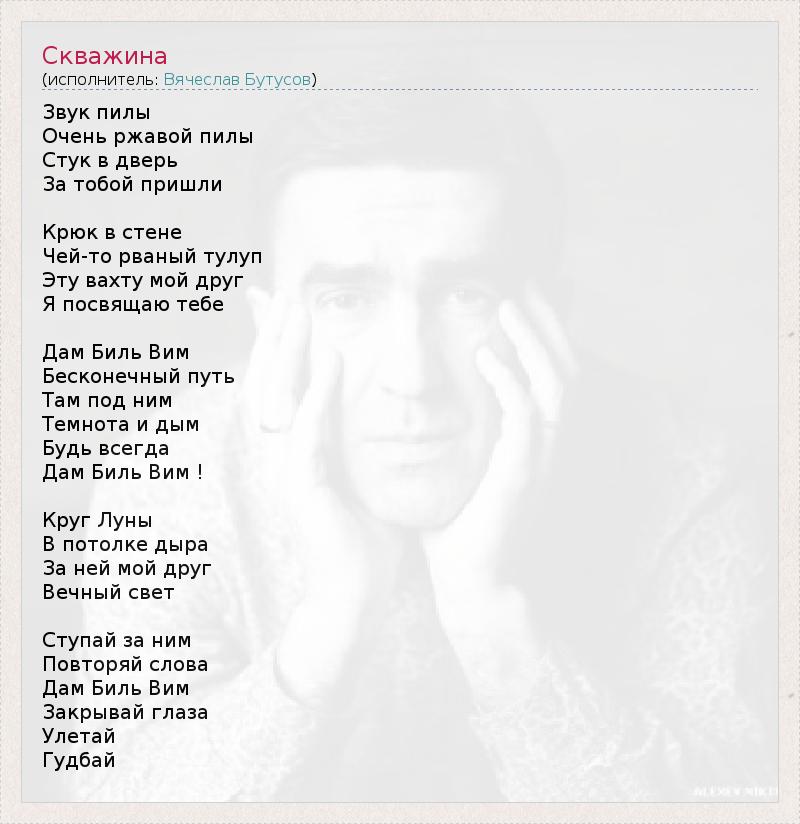 Это интересно:Вячеслав Геннадьевич Бутусов — русский рок-музыкант, лидер групп Nautilus Pompilius и Ю-Питер.Родился 15 октября 1961 года в поселке Бугач Красноярского края. Из-за профессии отца семья часто переезжала с места на место, поэтому до 9 класса Вячеслав учился и жил в различных сибирских городах. В 9 классе переезжает в Свердловск(сейчас Екатеринбург),... продолжение