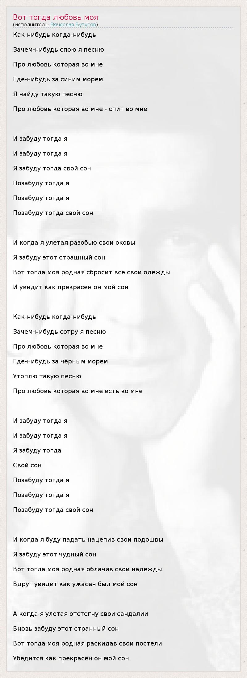 Как-нибудь когда-нибудь Зачем-нибудь спою я песню Про любовь которая во мне Где-нибудь за синим морем Я найду такую песню Про любовь которая во мне - спит во мне И забуду тогда я И забуду тогда я Я забуду тогда свой сон Позабуду тогда я Позабуду тогда я Позабуду тогда свой сон И когда я улетая разобью свои оковы Я забуду этот страшный сон Вот тогда моя родная сбросит все свои одежды И увидит как прекрасен он мой сон Как-нибудь когда-нибудь Зачем-нибудь сотру я песню Про любовь которая во мне Где-нибудь за чёрным морем Утоплю такую песню Про любовь которая во мне есть во мне И забуду тогда я И забуду тогда я Я забуду тогда Свой сон Позабуду тогда я Позабуду тогда я Позабуду тогда свой сон И когда я буду падать нацепив свои подошвы Я забуду этот чудный сон Вот тогда моя родная облачив свои надежды Вдруг увидит как ужасен был мой сон А когда я улетая отстегну свои сандалии Вновь забуду этот странный сон Вот тогда моя родная раскидав свои постели Убедится как прекрасен он мой сон.