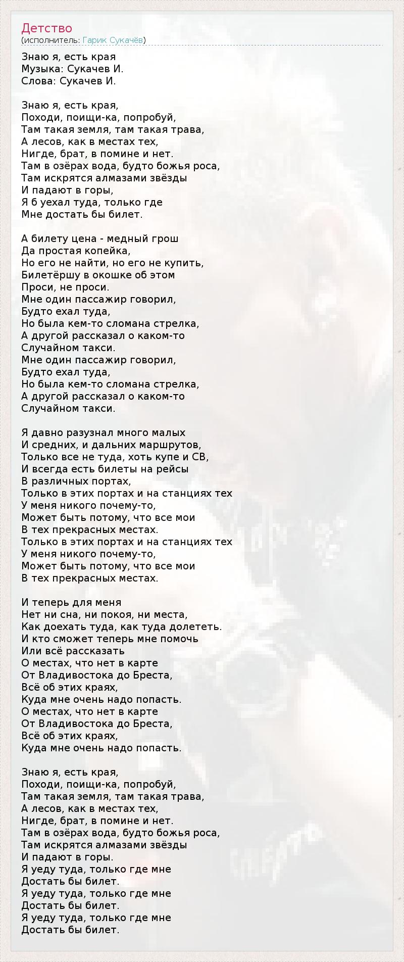Знаю я, есть края Музыка: Сукачев И. Слова: Сукачев И. Знаю я, есть края, Походи, поищи-ка, попробуй, Там такая земля, там такая трава, А лесов, как в местах тех, Нигде, брат, в помине и нет. Там в озёрах вода, будто божья роса, Там искрятся алмазами звёзды И падают в горы, Я б уехал туда, только где Мне достать бы билет. А билету цена - медный грош Да простая копейка, Но его не найти, но его не купить, Билетёршу в окошке об этом Проси, не проси. Мне один пассажир говорил, Будто ехал туда, Но была кем-то сломана стрелка, А другой рассказал о каком-то Случайном такси. Мне один пассажир говорил, Будто ехал туда, Но была кем-то сломана стрелка, А другой рассказал о каком-то Случайном такси. Я давно разузнал много малых И средних, и дальних маршрутов, Только все не туда, хоть купе и СВ, И всегда есть билеты на рейсы В различных портах, Только в этих портах и на станциях тех У меня никого почему-то, Может быть потому, что все мои В тех прекрасных местах. Только в этих портах и на станциях тех У меня никого почему-то, Может быть потому, что все мои В тех прекрасных местах. И теперь для меня Нет ни сна, ни покоя, ни места, Как доехать туда, как туда долететь. И кто сможет теперь мне помочь Или всё рассказать О местах, что нет в карте От Владивостока до Бреста, Всё об этих краях, Куда мне очень надо попасть. О местах, что нет в карте От Владивостока до Бреста, Всё об этих краях, Куда мне очень надо попасть. Знаю я, есть края, Походи, поищи-ка, попробуй, Там такая земля, там такая трава, А лесов, как в местах тех, Нигде, брат, в помине и нет. Там в озёрах вода, будто божья роса, Там искрятся алмазами звёзды И падают в горы. Я уеду туда, только где мне Достать бы билет. Я уеду туда, только где мне Достать бы билет. Я уеду туда, только где мне Достать бы билет. Гарик Сукачев - Знаю я, есть края... http://megalyrics.ru/lyric/%D0%B3%D0%B0%D1%80%D0%B8%D0%BA-%D1%81%D1%83%D0%BA%D0%B0%D1%87%D0%B5%D0%B2/%D0%B7%D0%BD%D0%B0%D1%8E-%D1%8F-%D0%B5%D1%81%D1%82%D1%8C-%D0%BA%D1%80%D0%B0%D1%8F.htm#ixzz26jzBeo4Z