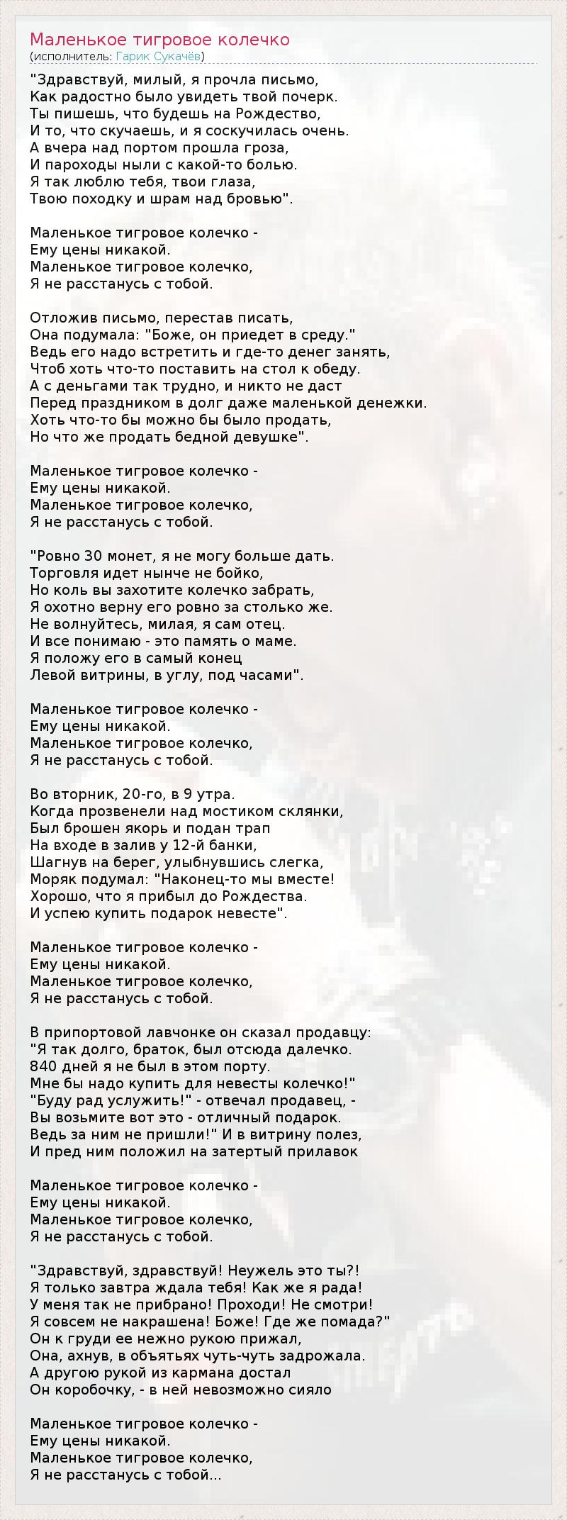 "Здравствуй, милый, я прочла письмо, Как радостно было увидеть твой почерк. Ты пишешь, что будешь на Рождество, И то, что скучаешь, и я соскучилась очень. А вчера над портом прошла гроза, И пароходы ныли с какой-то болью. Я так люблю тебя, твои глаза, Твою походку и шрам над бровью". Маленькое тигровое колечко - Ему цены никакой. Маленькое тигровое колечко, Я не расстанусь с тобой. Отложив письмо, перестав писать, Она подумала: "Боже, он приедет в среду." Ведь его надо встретить и где-то денег занять, Чтоб хоть что-то поставить на стол к обеду. А с деньгами так трудно, и никто не даст Перед праздником в долг даже маленькой денежки. Хоть что-то бы можно бы было продать, Но что же продать бедной девушке". Маленькое тигровое колечко - Ему цены никакой. Маленькое тигровое колечко, Я не расстанусь с тобой. "Ровно 30 монет, я не могу больше дать. Торговля идет нынче не бойко, Но коль вы захотите колечко забрать, Я охотно верну его ровно за столько же. Не волнуйтесь, милая, я сам отец. И все понимаю - это память о маме. Я положу его в самый конец Левой витрины, в углу, под часами". Маленькое тигровое колечко - Ему цены никакой. Маленькое тигровое колечко, Я не расстанусь с тобой. Во вторник, 20-го, в 9 утра. Когда прозвенели над мостиком склянки, Был брошен якорь и подан трап На входе в залив у 12-й банки, Шагнув на берег, улыбнувшись слегка, Моряк подумал: "Наконец-то мы вместе! Хорошо, что я прибыл до Рождества. И успею купить подарок невесте". Маленькое тигровое колечко - Ему цены никакой. Маленькое тигровое колечко, Я не расстанусь с тобой. В припортовой лавчонке он сказал продавцу: "Я так долго, браток, был отсюда далечко. 840 дней я не был в этом порту. Мне бы надо купить для невесты колечко!" "Буду рад услужить!" - отвечал продавец, - Вы возьмите вот это - отличный подарок. Ведь за ним не пришли!" И в витрину полез, И пред ним положил на затертый прилавок Маленькое тигровое колечко - Ему цены никакой. Маленькое тигровое колечко, Я не расстанусь с тобой. "Здравствуй, здравствуй! Неужель это ты?! Я только завтра ждала тебя! Как же я рада! У меня так не прибрано! Проходи! Не смотри! Я совсем не накрашена! Боже! Где же помада?" Он к груди ее нежно рукою прижал, Она, ахнув, в объятьях чуть-чуть задрожала. А другою рукой из кармана достал Он коробочку, - в ней невозможно сияло Маленькое тигровое колечко - Ему цены никакой. Маленькое тигровое колечко, Я не расстанусь с тобой...