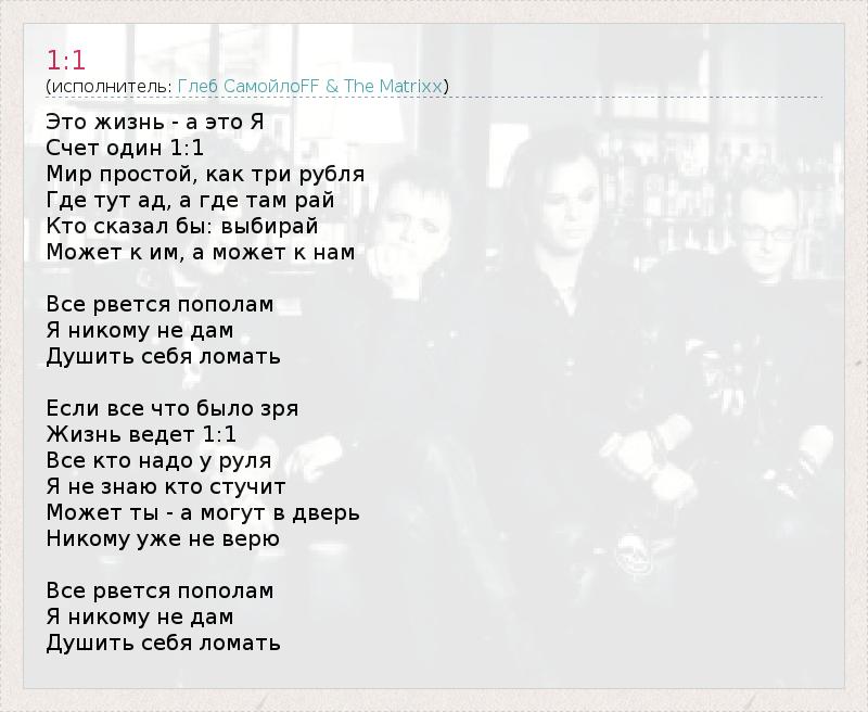 Это жизнь - а это Я Счет один 1:1 Мир простой, как три рубля Где тут ад, а где там рай Кто сказал бы: выбирай Может к им, а может к нам Все рвется пополам Я никому не дам Душить себя ломать Если все что было зря Жизнь ведет 1:1 Все кто надо у руля Я не знаю кто стучит Может ты - а могут в дверь Никому уже не верю Все рвется пополам Я никому не дам Душить себя ломать