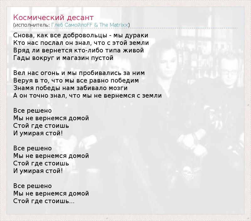 Это интересно:В 2009 г. Глеб Самойлов создал новую группу "ГЛЕБ САМОЙЛОFF & THE MATRIXX".C лета 2013 года название изменено на The Matrixx.Название это - новое, однако все четверо музыкантов прекрасно знакомы любителям русского рока. Начнем с Глеба Самойлова - вокалиста, гитариста, басиста, клавишника, поэта, композитора, одной из ключевых фигур в истории "Агаты" + Барабанщик Дмитрий... продолжение