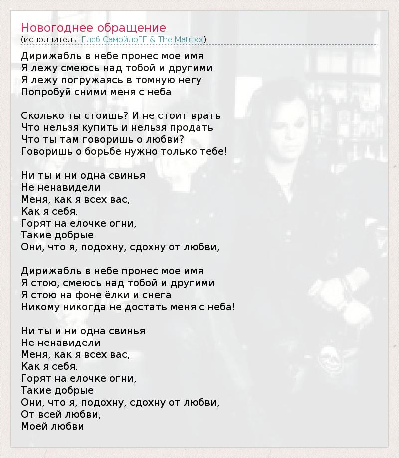 Дирижабль в небе пронес мое имя Я лежу смеюсь над тобой и другими Я лежу погружаясь в томную негу Попробуй сними меня с неба Сколько ты стоишь? И не стоит врать Что нельзя купить и нельзя продать Что ты там говоришь о любви? Говоришь о борьбе нужно только тебе! Ни ты и ни одна свинья Не ненавидели Меня, как я всех вас, Как я себя. Горят на елочке огни, Такие добрые Они, что я, подохну, сдохну от любви, Дирижабль в небе пронес мое имя Я стою, смеюсь над тобой и другими Я стою на фоне ёлки и снега Никому никогда не достать меня с неба! Ни ты и ни одна свинья Не ненавидели Меня, как я всех вас, Как я себя. Горят на елочке огни, Такие добрые Они, что я, подохну, сдохну от любви, От всей любви, Моей любви