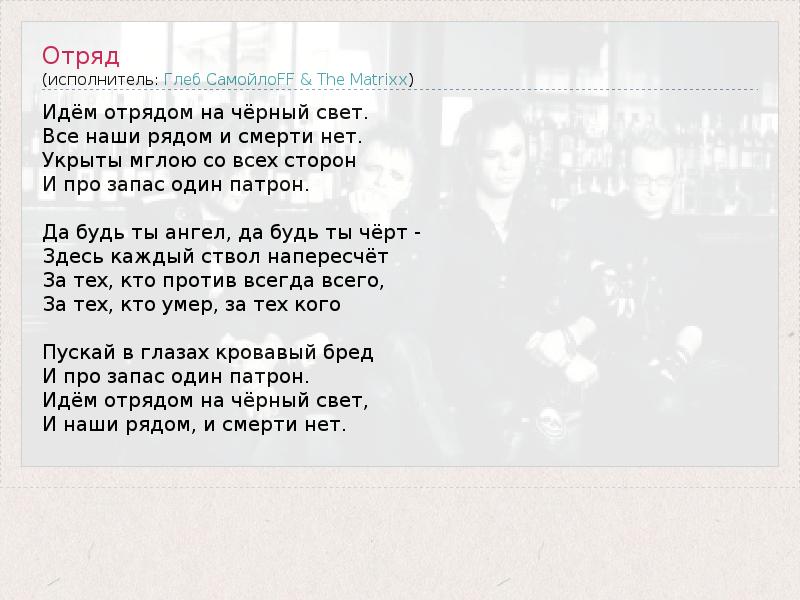 Идём отрядом на чёрный свет. Все наши рядом и смерти нет. Укрыты мглою со всех сторон И про запас один патрон. Да будь ты ангел, да будь ты чёрт - Здесь каждый ствол напересчёт За тех, кто против всегда всего, За тех, кто умер, за тех кого Пускай в глазах кровавый бред И про запас один патрон. Идём отрядом на чёрный свет, И наши рядом, и смерти нет.