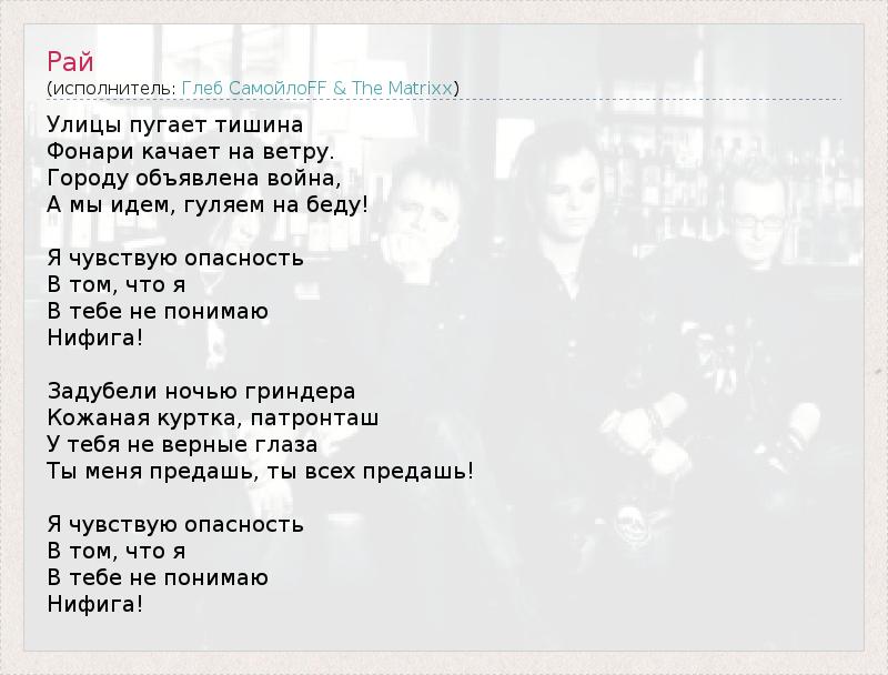 Улицы пугает тишина Фонари качает на ветру. Городу объявлена война, А мы идем, гуляем на беду! Я чувствую опасность В том, что я В тебе не понимаю Нифига! Задубели ночью гриндера Кожаная куртка, патронташ У тебя не верные глаза Ты меня предашь, ты всех предашь! Я чувствую опасность В том, что я В тебе не понимаю Нифига!