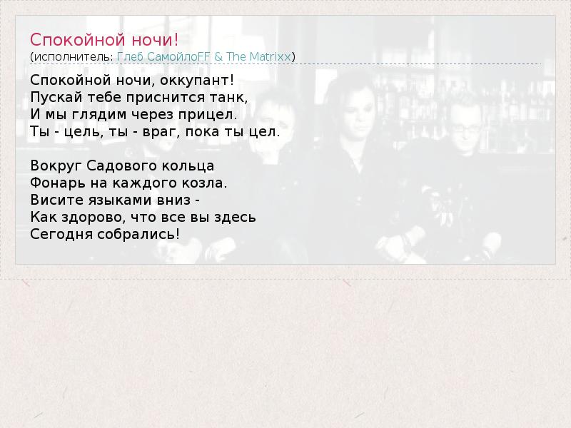 Спокойной ночи, оккупант! Пускай тебе приснится танк, И мы глядим через прицел. Ты - цель, ты - враг, пока ты цел. Вокруг Садового кольца Фонарь на каждого козла. Висите языками вниз - Как здорово, что все вы здесь Сегодня собрались!