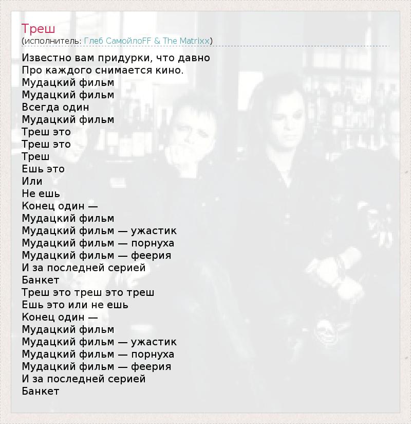 Это интересно:В 2009 г. Глеб Самойлов создал новую группу "ГЛЕБ САМОЙЛОFF & THE MATRIXX".C лета 2013 года название изменено на The Matrixx.Название это - новое, однако все четверо музыкантов прекрасно знакомы любителям русского рока. Начнем с Глеба Самойлова - вокалиста, гитариста, басиста, клавишника, поэта, композитора, одной из ключевых фигур в истории "Агаты" + Барабанщик Дмитрий... продолжение