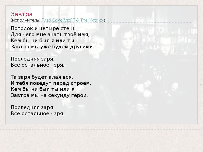 Потолок и четыре стены. Для чего мне знать твоё имя, Кем бы ни был я или ты, Завтра мы уже будем другими. Последняя заря. Всё остальное - зря. Та заря будет алая вся, И тебя поведут перед строем. Кем бы ни был ты или я, Завтра мы на секунду герои. Последняя заря. Всё остальное - зря.