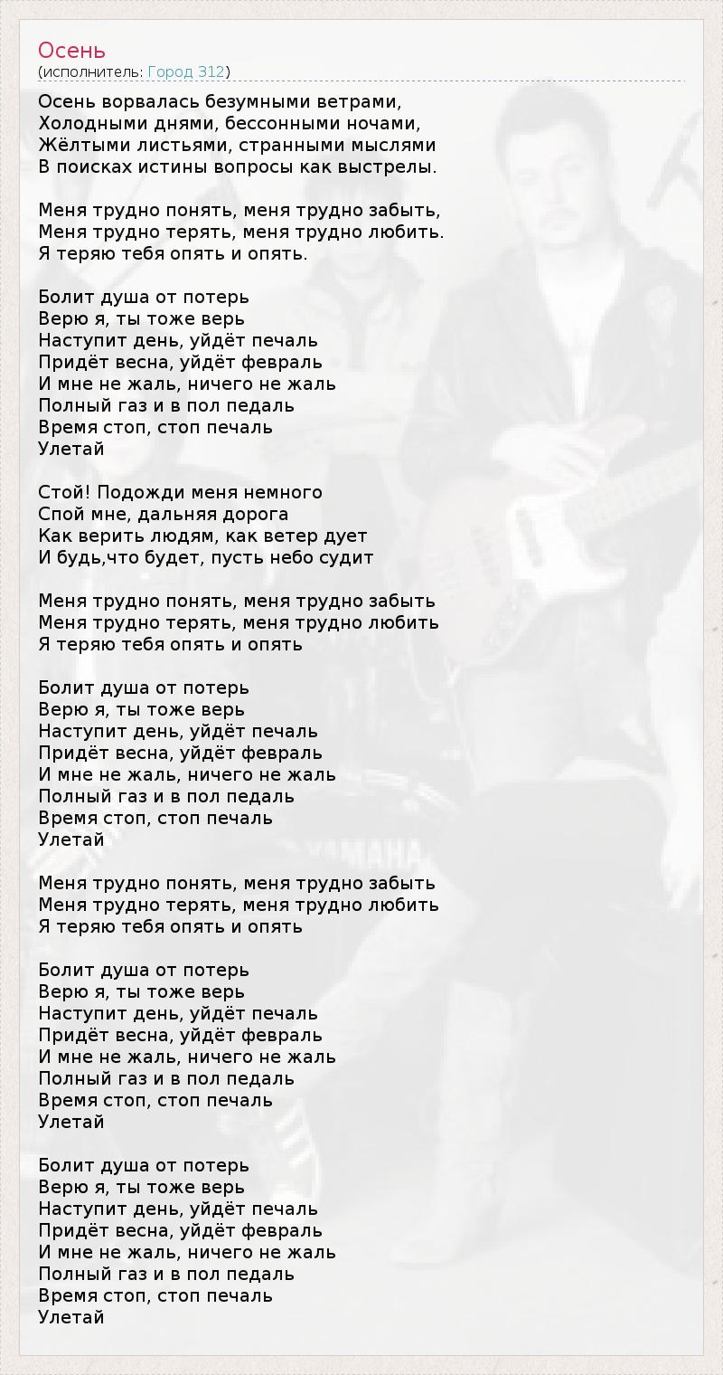Это интересно:«Город 312» (часто: «Город», «Горожане») - группа из города Бишкек (Киргизия), играющая поп-рок.Состав группы:Ая - вокал (консерватория по классу эстрадного вокала) Маша - гитара (частная школа игры на гитаре) Дим - клавишные (бэк-вокал; отделение хорового дирижирования) Леон - бас, бэк-вокал (эстрадное отделение музыкального училища по классу бас-гитары) До июля 2009 года барабанщиком... продолжение
